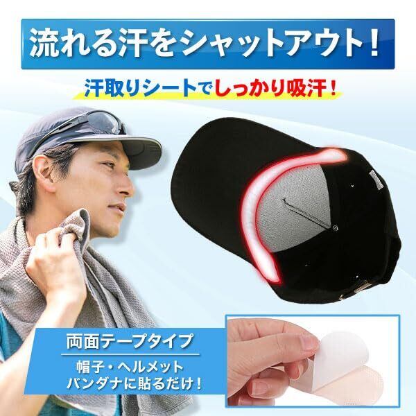 汗取りシートでしっかり吸汗!両面テープがついてるので、帽子・ヘルメット・シャツに貼るだけで、流れる汗をシャットアウト!