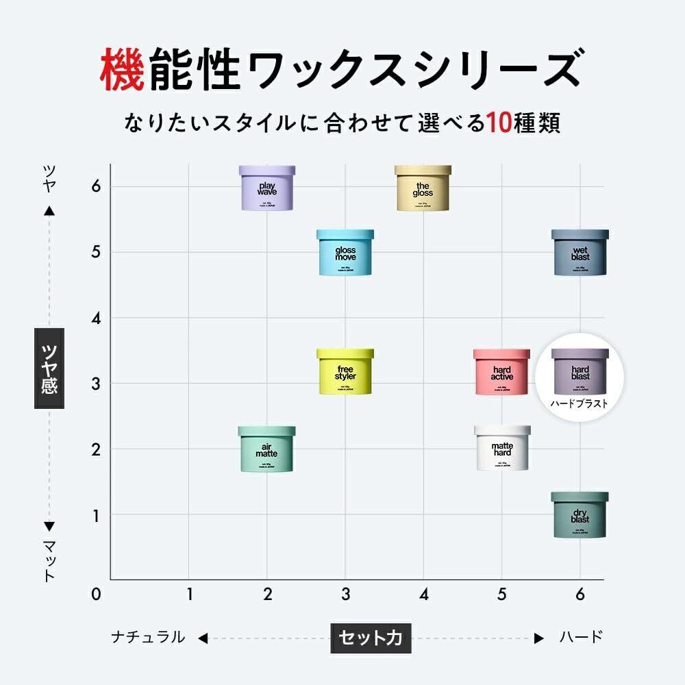 【ハードブラスト】スーパーハードなセット&キープ力で、絶妙ラフ束感が自由自在に舞い散ります。突き抜けたムーブ感&キープ力で、軟毛の方でも十分に“ブラスト質感”を体感できます。