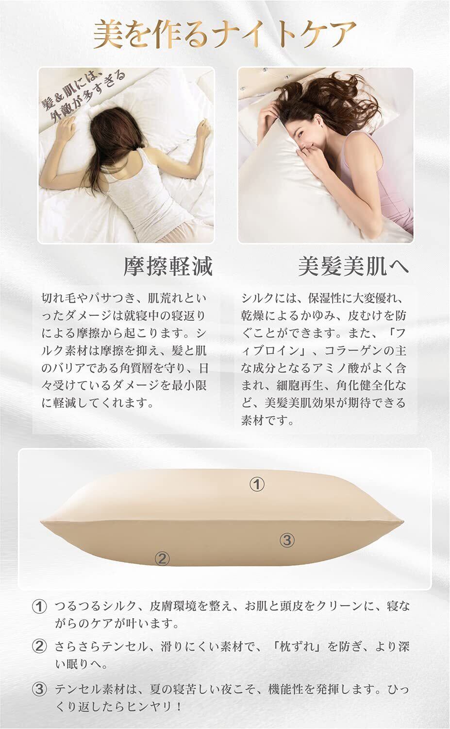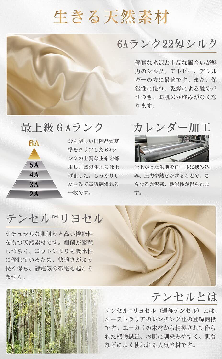 【天然繊維へのこだわり】古くから愛用されていたシルク素材、格調高雅な風合いと光沢が人々を魅了します。その中でもっとも希少な6Aクラス生糸を厳選しております。さらに、厚手の22匁生地を使用し、滑らかな肌触りとドレープ感をお楽しみいただけます。また、独自のカレンダー加工により、さらなる密度とつややかさをプラスします。シルク繊維は皮膚に最も近い成分でできているため、お肌と髪を守る最高の素材です。裏面のテンセル(リヨセル)生地は天然木材から作られた素材です。シルクと同じく肌に優しく上品な風合いで人気を博しています。肌に刺激を与えることがほとんどなく、お肌が弱い方にも安心してお使いいただけます。機能性が満点な二種類生地で絶妙なハーモニーがうまれ、触れるたび心も身体も癒してくれます。