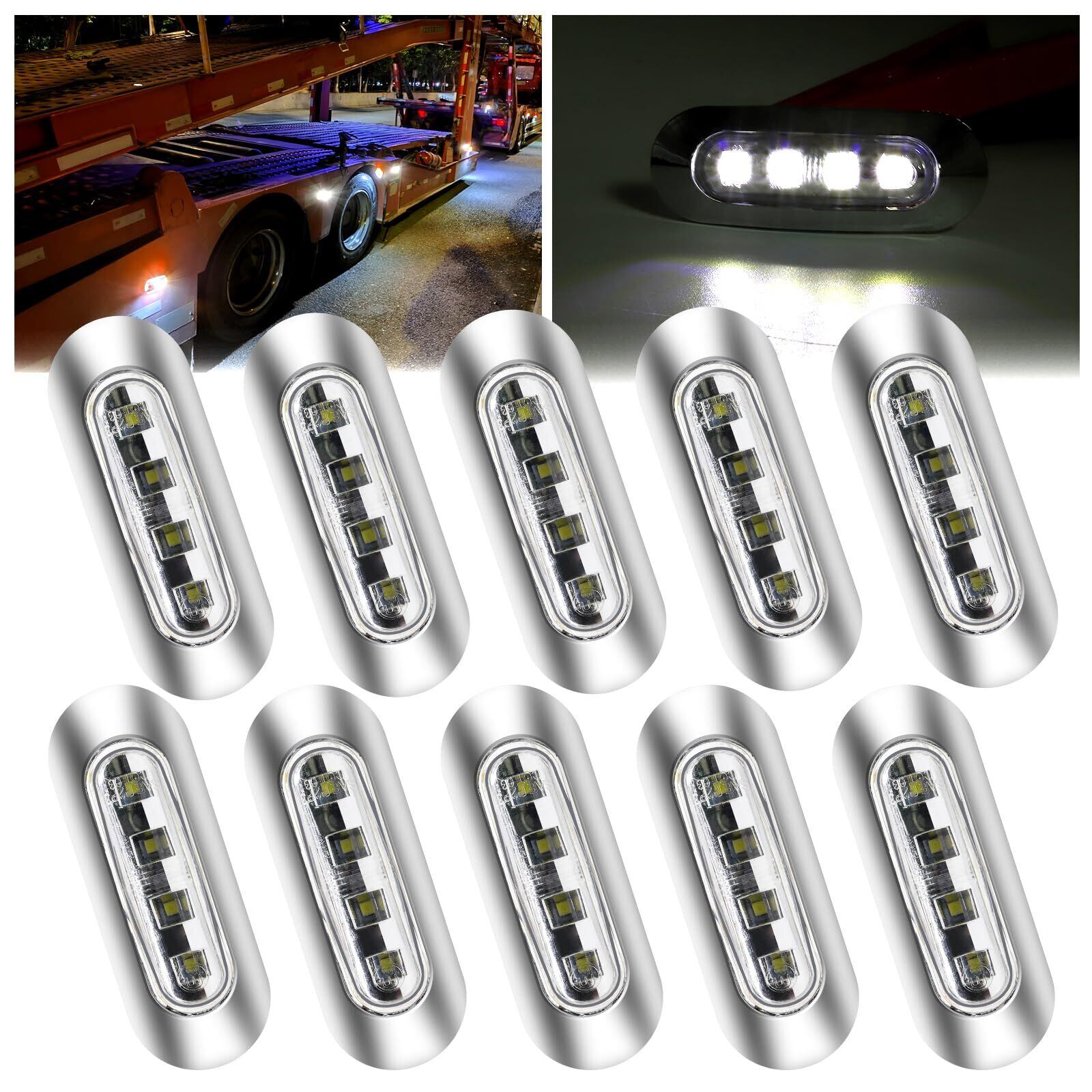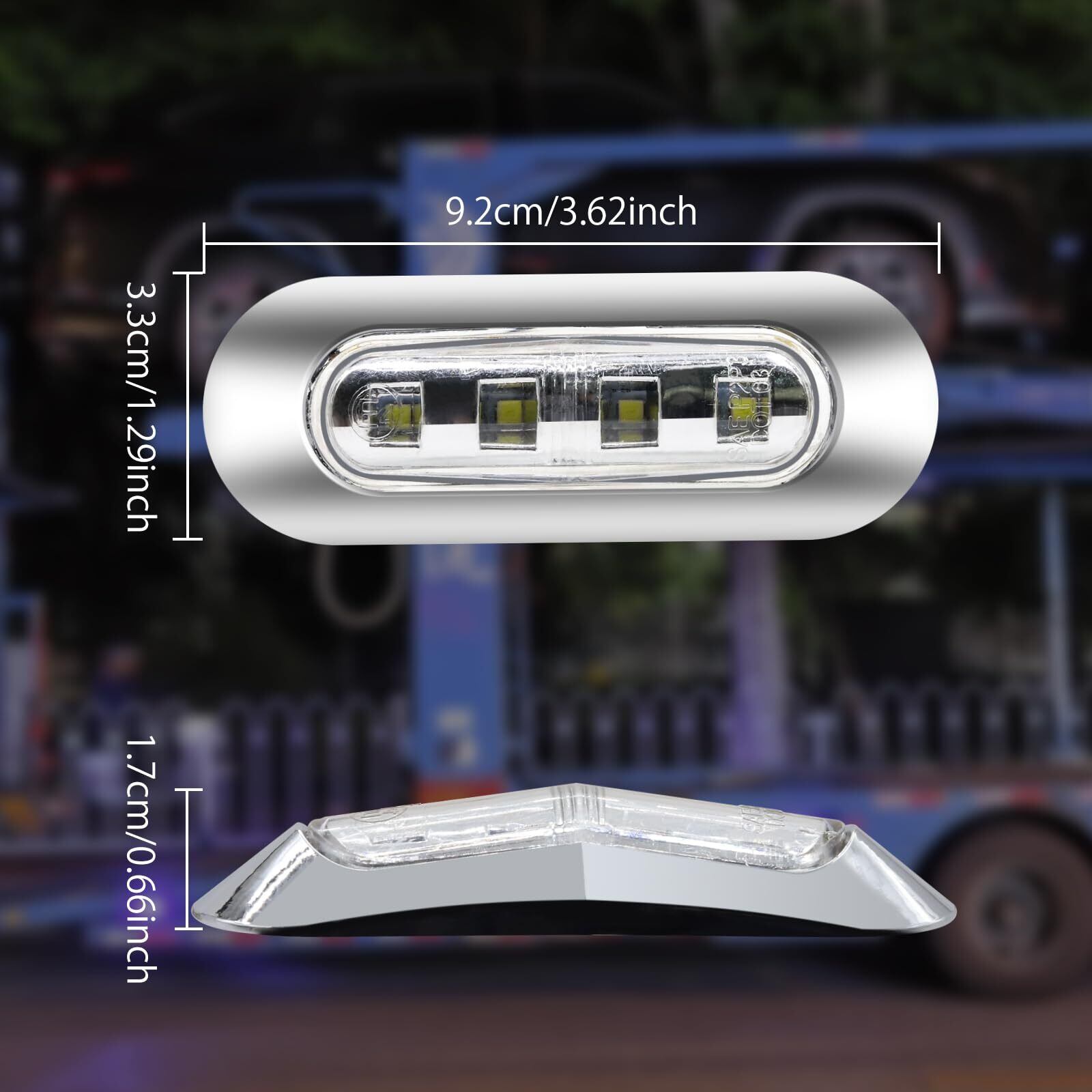 【商品内容】サイズ:9.2×3.3×1.7cm レンズカラー:ホワイト 発光色:白色 消費電力:12V 24V 材質:クロームメッキ+PCポリカーボネート+4連LED 適応車種:トラック、産業車、ローリー、トレーラー、バス、RV、デコトラなど様々な車類に適用します。