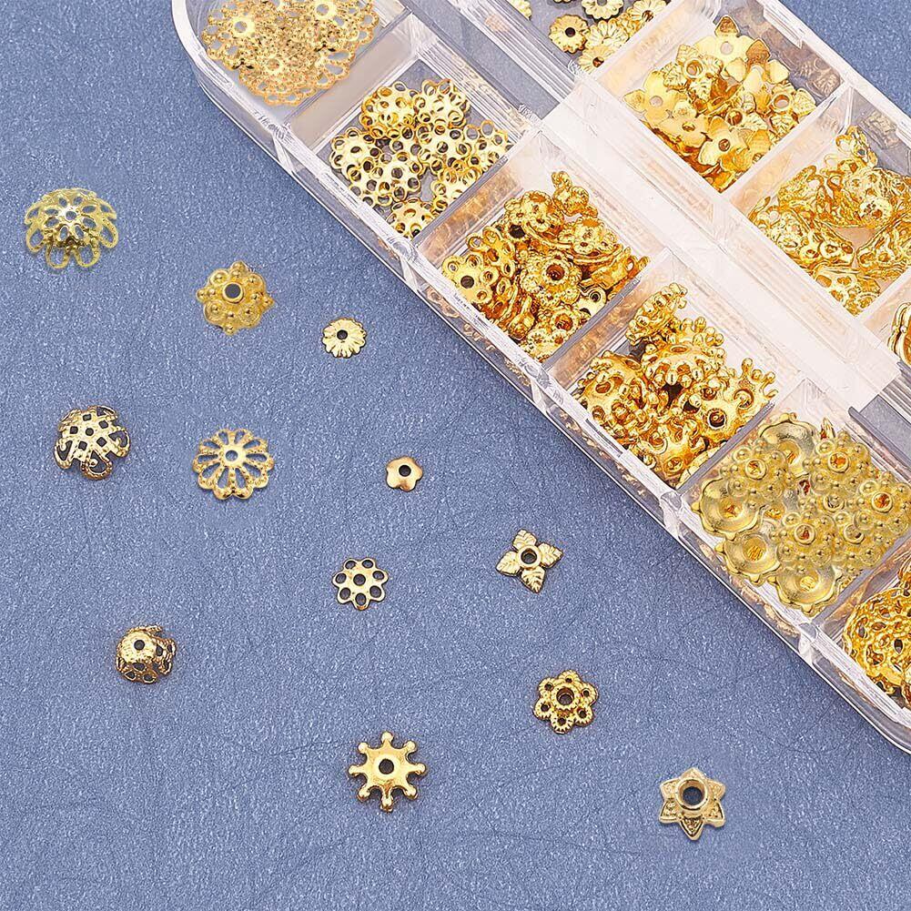 【240個12種ビーズキャップ】:金色ビーズキャップは全部で12種の異なるデザインがあり、毎種のデザインは異なる感じがあります。全部で240個あります。数が非常に多く、大量のビーズキャップを必要とするお客様に最適です。