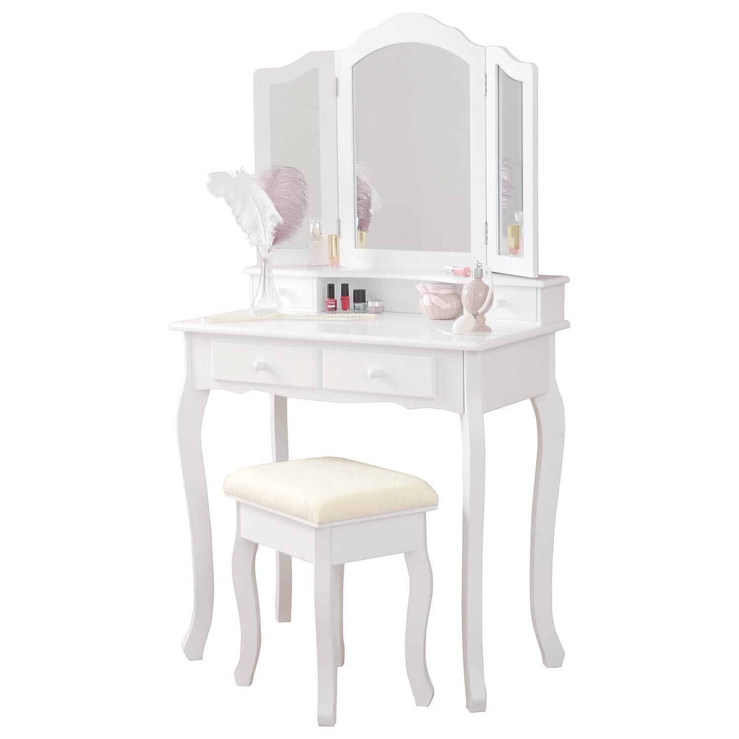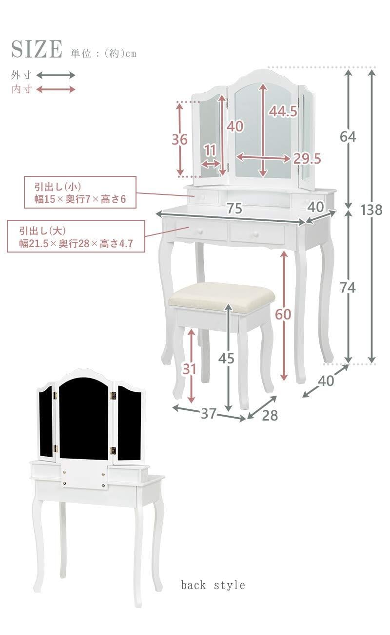 【商品サイズ(約)】ドレッサー:幅75×奥行40×高さ138cm/スツール:幅37×奥行28×高さ45cm