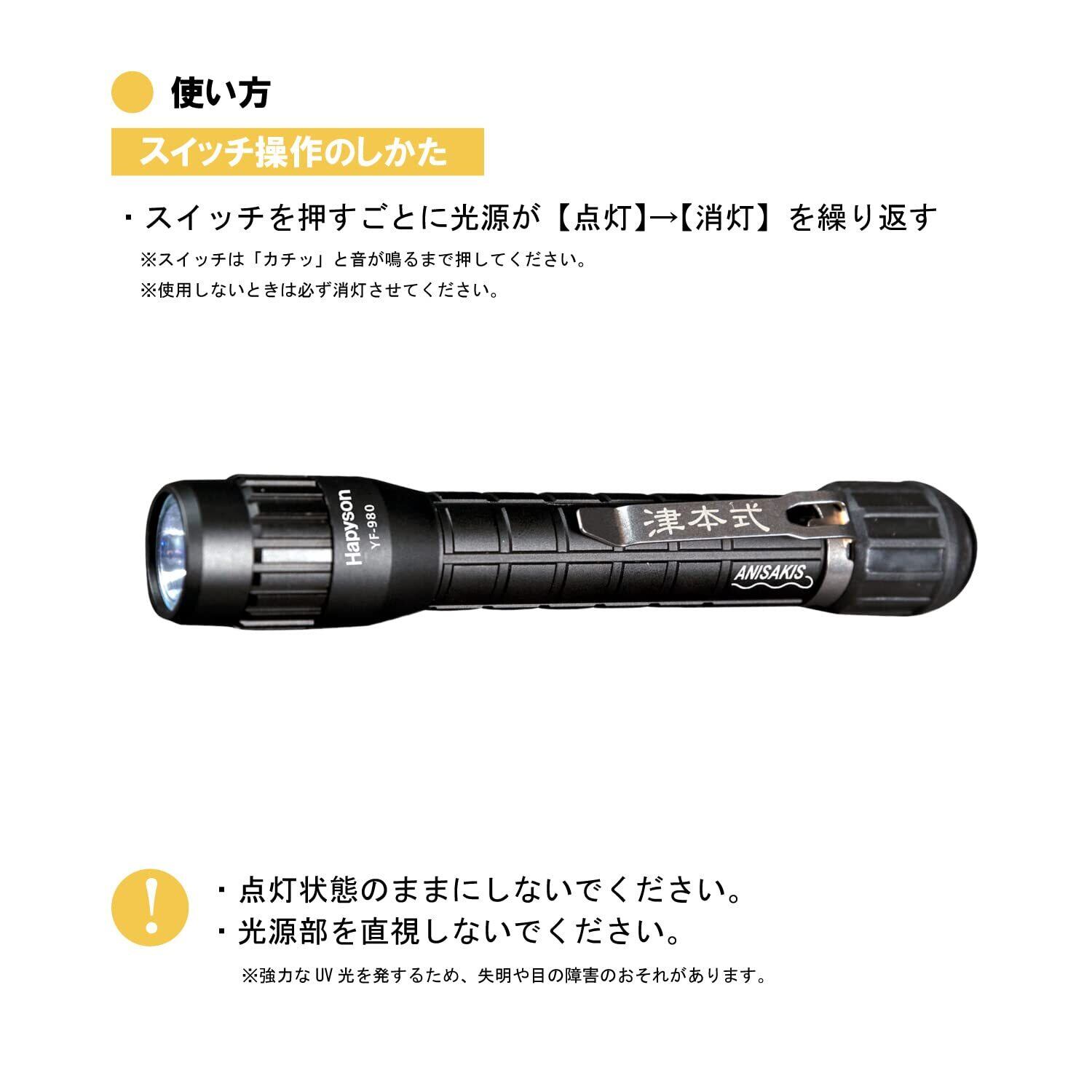 Hapyson(ハピソン)YF-980 アニサキスライト!!アニサキスを照らしだす!津本氏監修、アニサキスを見つけるブラックライト!完全防水の IPX7!!まな板や魚の身、内臓にいるアニサキスをクリアに映し出す光の波長!高透過紫外線レンズを採用!ハイパワーブラックライト!*使用上の注意:点灯状態のままにしないで下さい。光源部を直視しないでください。強力なUV光を発するため、失明や目の障害のおそれがあります。