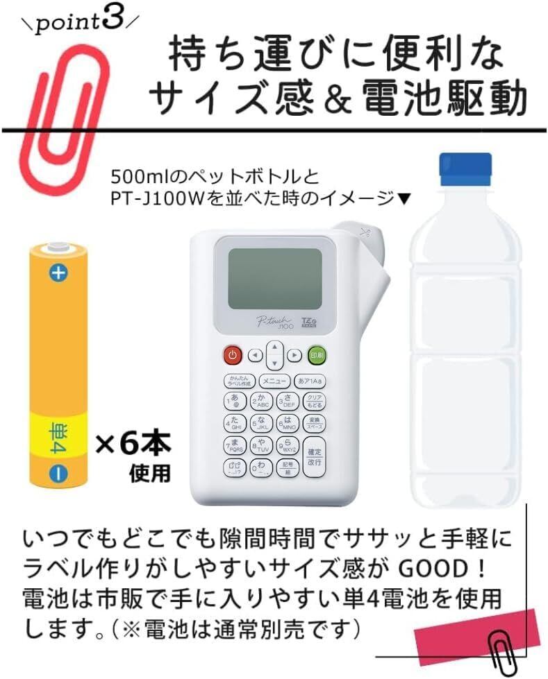 ● バッテリーも充実! ● 単四電池8本が付属しており、すぐに使用開始できます。電池の交換が容易で、長時間の使用も可能です。手間をかけずに、ラベル作成を楽しむことができます。