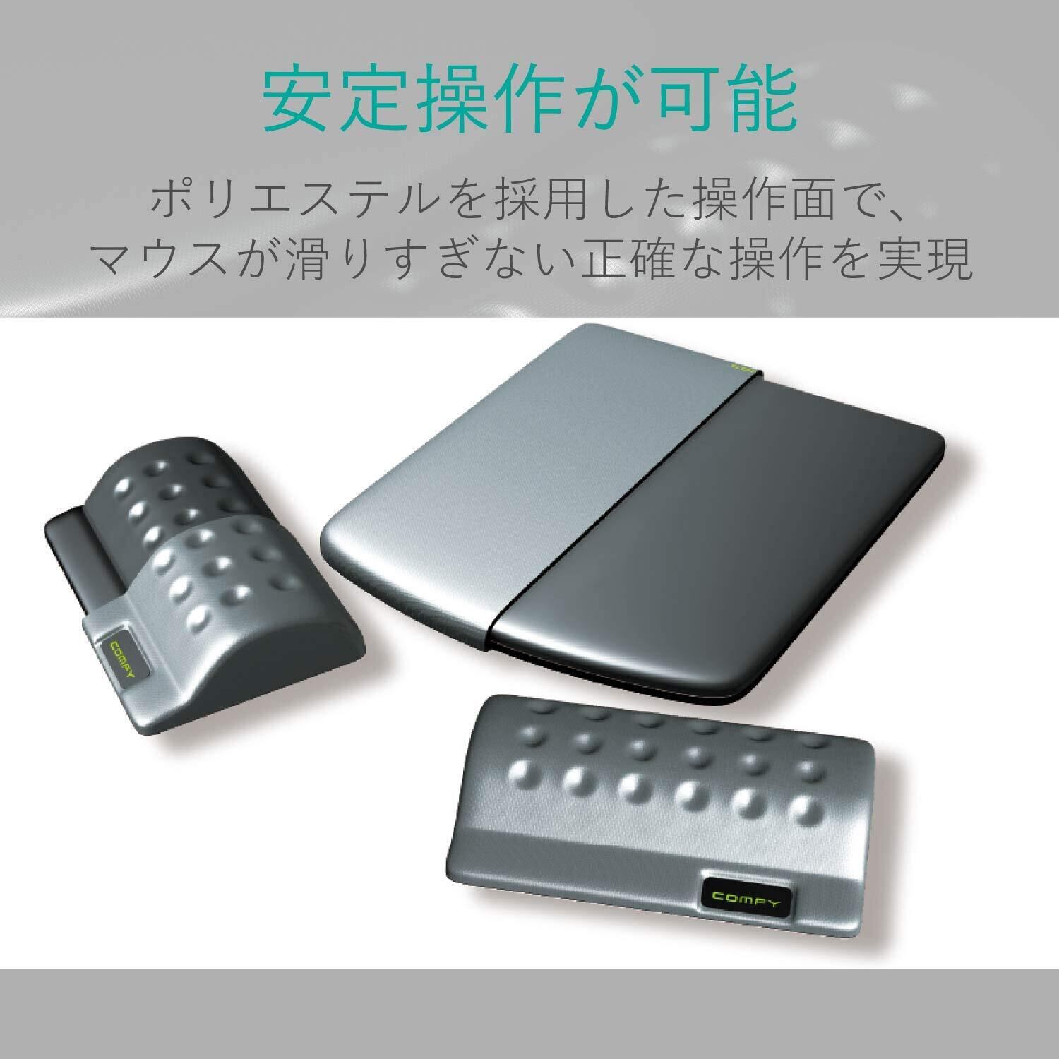 ●マウスパッドとリストレストを自由自在なレイアウトで最適な位置に移動できる、リストレスト&マウスパッド“COMFY(カンフィー)”です。●マウスパッドのマウス操作面にはポリエステルを採用し、ソフトなさわり心地と、マウスが滑りすぎない静かな操作感を実現します。●マウスパッド裏面には、デスクにぴったりと吸着してズレや移動を防ぐエラストマーを使用しています。●リストレストには、反発弾性が非常に小さく、優れた衝撃吸収性と荷重分散性能を有する低反発ポリウレタンを採用し、手首の形状にフィットして長時間のPC作業をサポートします。●リストレストはキーボードやテンキーのリストレストとしてもご利用いただけます。●リストレストには新開発のディンプル加工(凹凸加工)を施し、心地よい感触と通気性を向上しています。