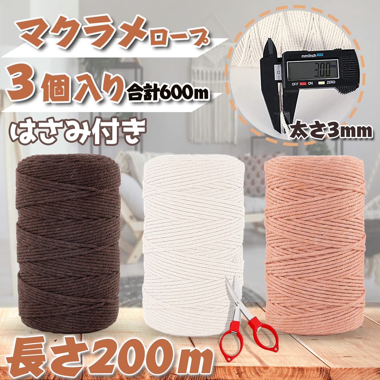 【サイズと包装】1巻き当たり長さ約220ヤード(200 M)、直径3 mmのマクラメ糸、スーツに3巻きの(サーモンピンク,アイボリー,ダークブラウン)いマクラメ糸がついていて、1本のはさみがついていて切断して使いやすいです。これは4本の撚り100%綿糸です。手芸プログラムには、マクラメ糸は厚くて頑丈です。