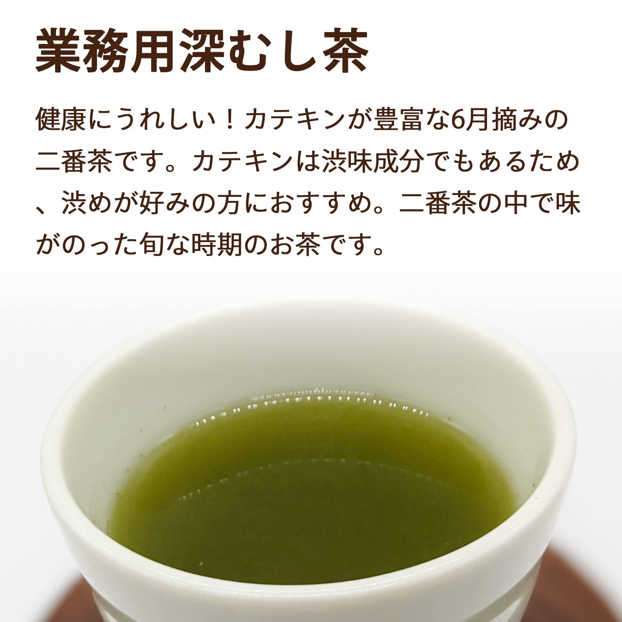 一般的な煎茶(茶葉の抽出液)に対し深むし製法では茶葉そのものが溶け出します。水色、旨みに加え茶葉の健康成分もたっぷり溶け出しています。茶葉は細かくなり、見た目は良くありませんが茶葉の形状より「味を重視」したのが深むし茶なのです。 業務用深むし茶は6月摘みの二番茶を使用。二番茶は一番に摘んだ茶葉に比べ健康にうれしいカテキンが豊富です。カテキンは渋味成分でもあるため、渋めが好みの方にはおすすめです。さらに、荒茶から出物(粉・茎など)を除きお茶の葉のみを選別。いわゆる本茶です。