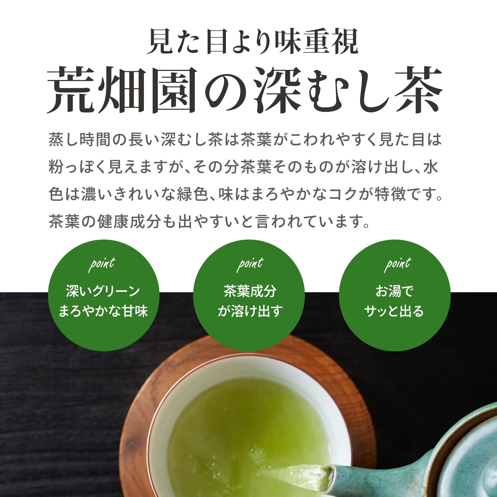 上質の茶葉を活かす深むし製法:荒畑園のお茶は普通煎茶の三~四倍長く茶葉を蒸す深むし製法でつくった「深むし茶」です。