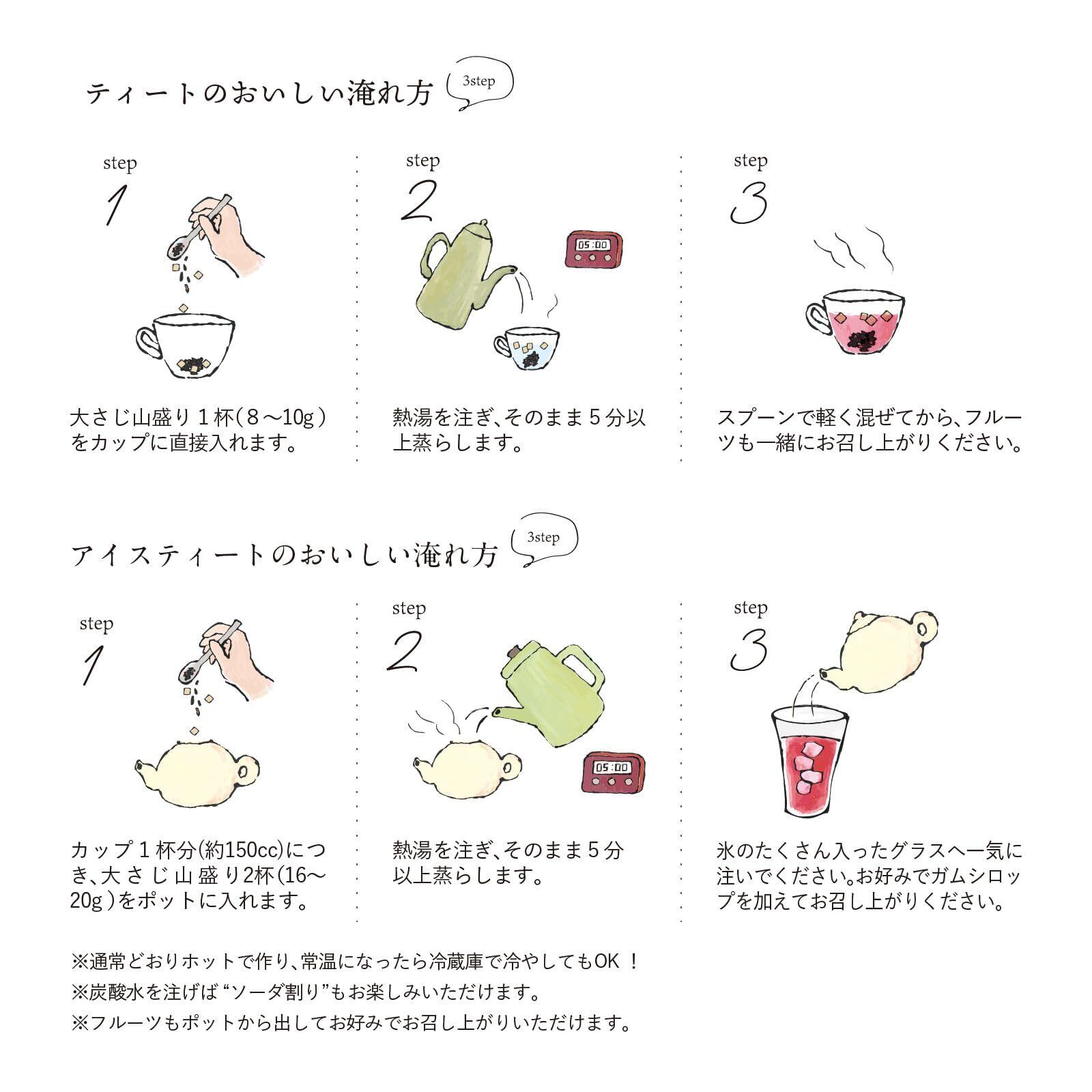 大さじ山盛り1杯(10g程)をカップに入れ、熱湯を注ぎ5分程蒸らした後、軽く混ぜてからフルーツも一緒にお召し上がりください。