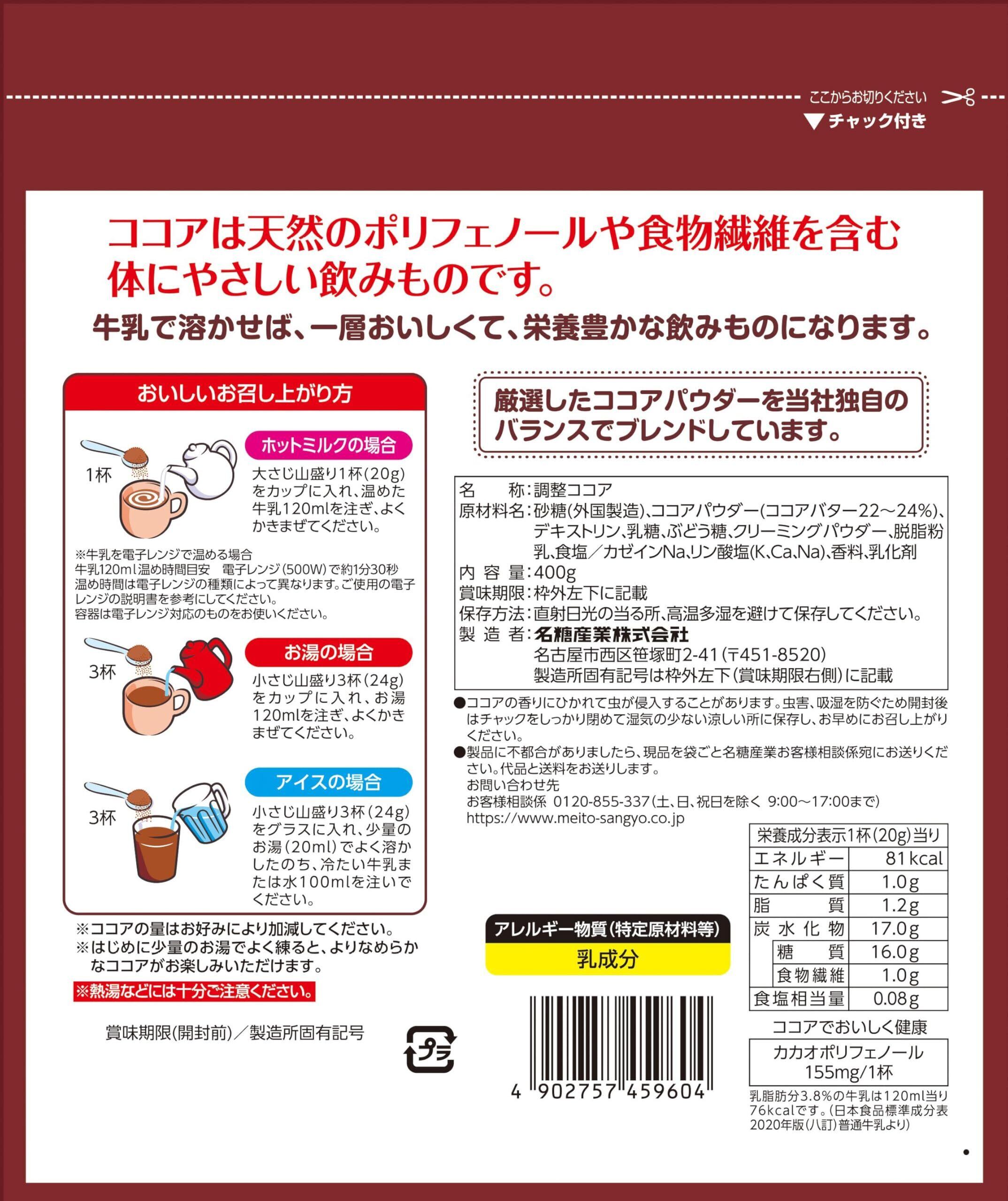 砂糖(外国製造)、ココアパウダー(ココアバター22~24%)、デキストリン、乳糖、ぶどう糖、クリーミングパウダー、脱脂粉乳、食塩/カゼインNa、リン酸塩(K、Ca、Na)、香料、乳化剤