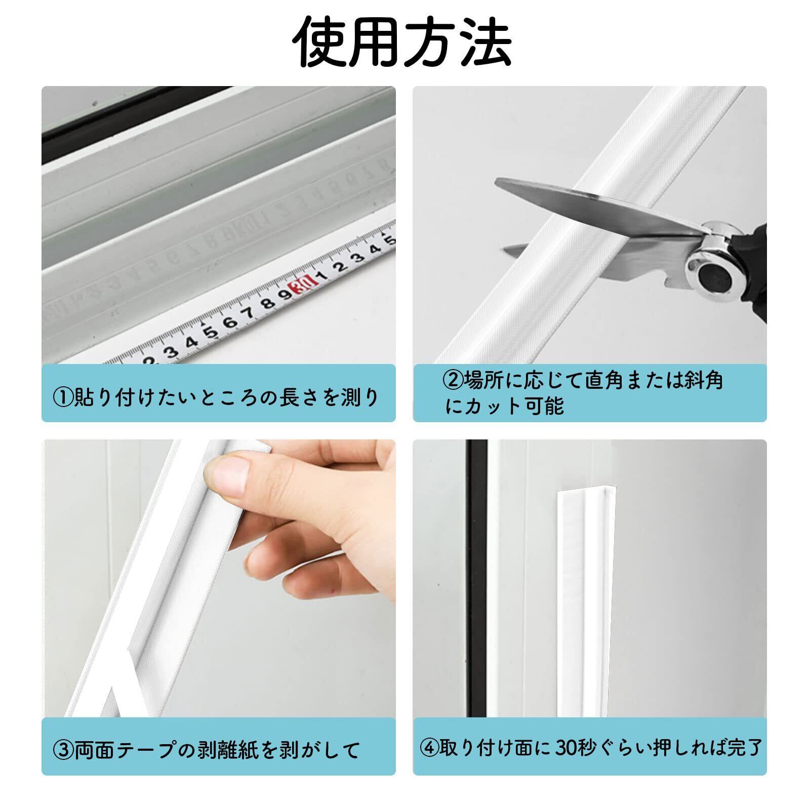 【両面テープ-取り付け簡単】付属の粘着テープも強力なもののため、長持ちする隙間テープです。白い紙を剥がして、取り付ければ完了。※固定位置に30秒くらい押して貼り付けてください。自由にカットできる隙間テープで、必要に応じて適切な長さにカットすることも可能です。
