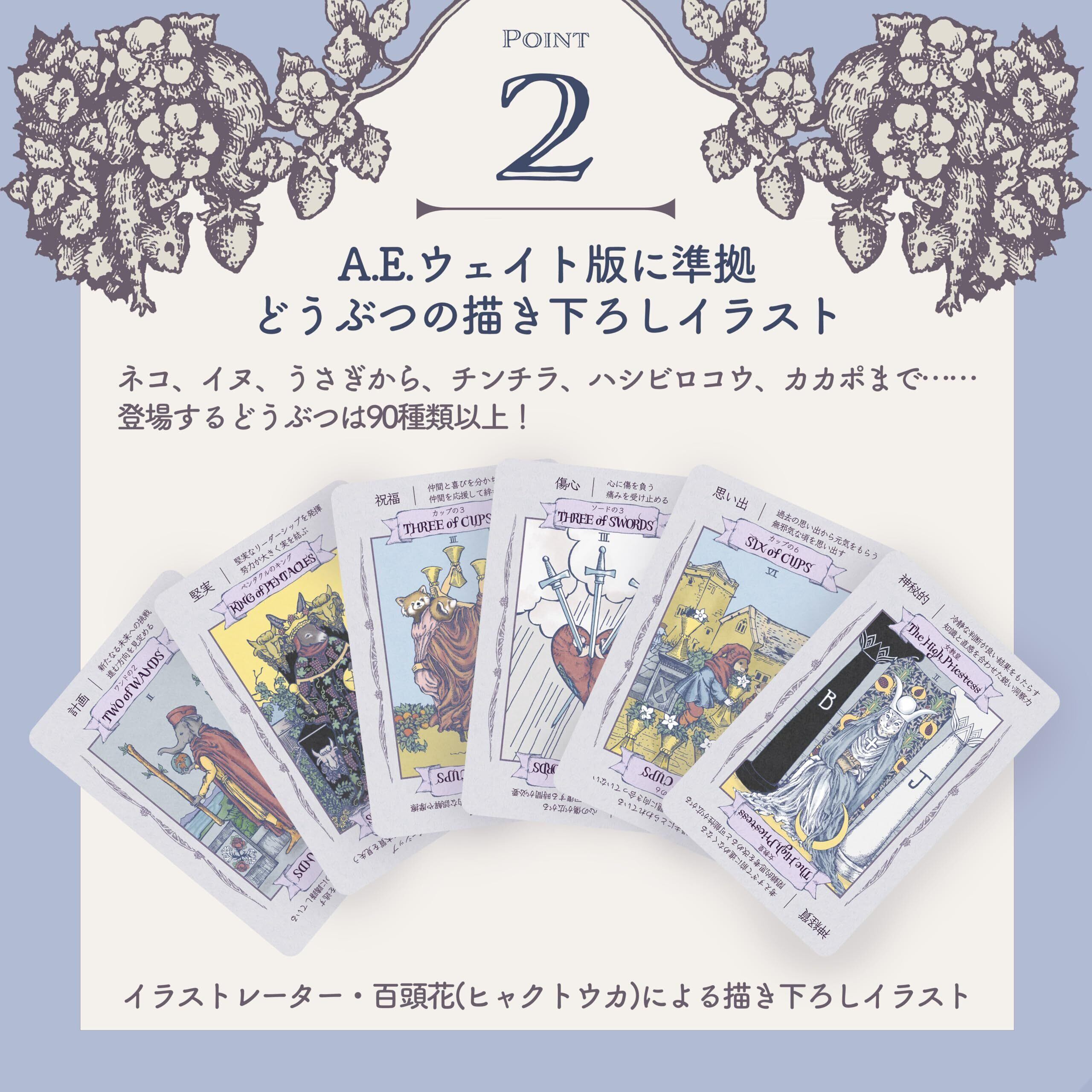 イラストレーター 百頭花 ヒャクトウカさん書き下ろしの、ウェイト版に準拠した、どうぶつの絵柄のタロットカードです。