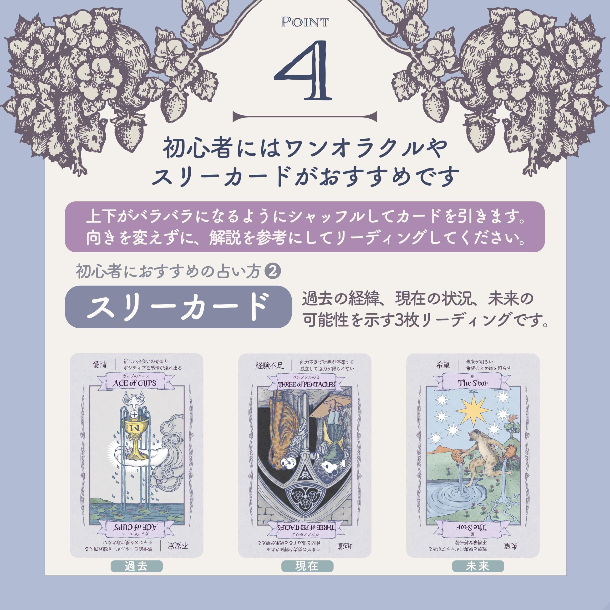 全く知識がない状態でも、占いたいことを思い浮かべて、シャッフルして1枚引くだけで占うことができます。