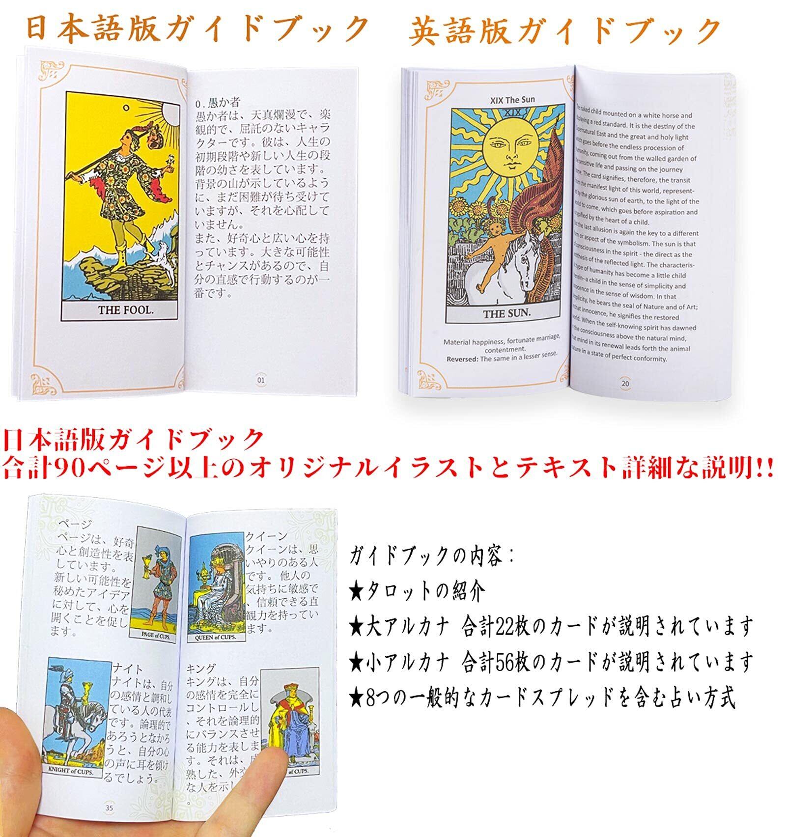 このタロットには、各カードの絵柄の詳細やタロットの使い方を記した日本語ガイドブックと英語ガイドブックが付属しています。初めての方でも安心してお使いいただけます。