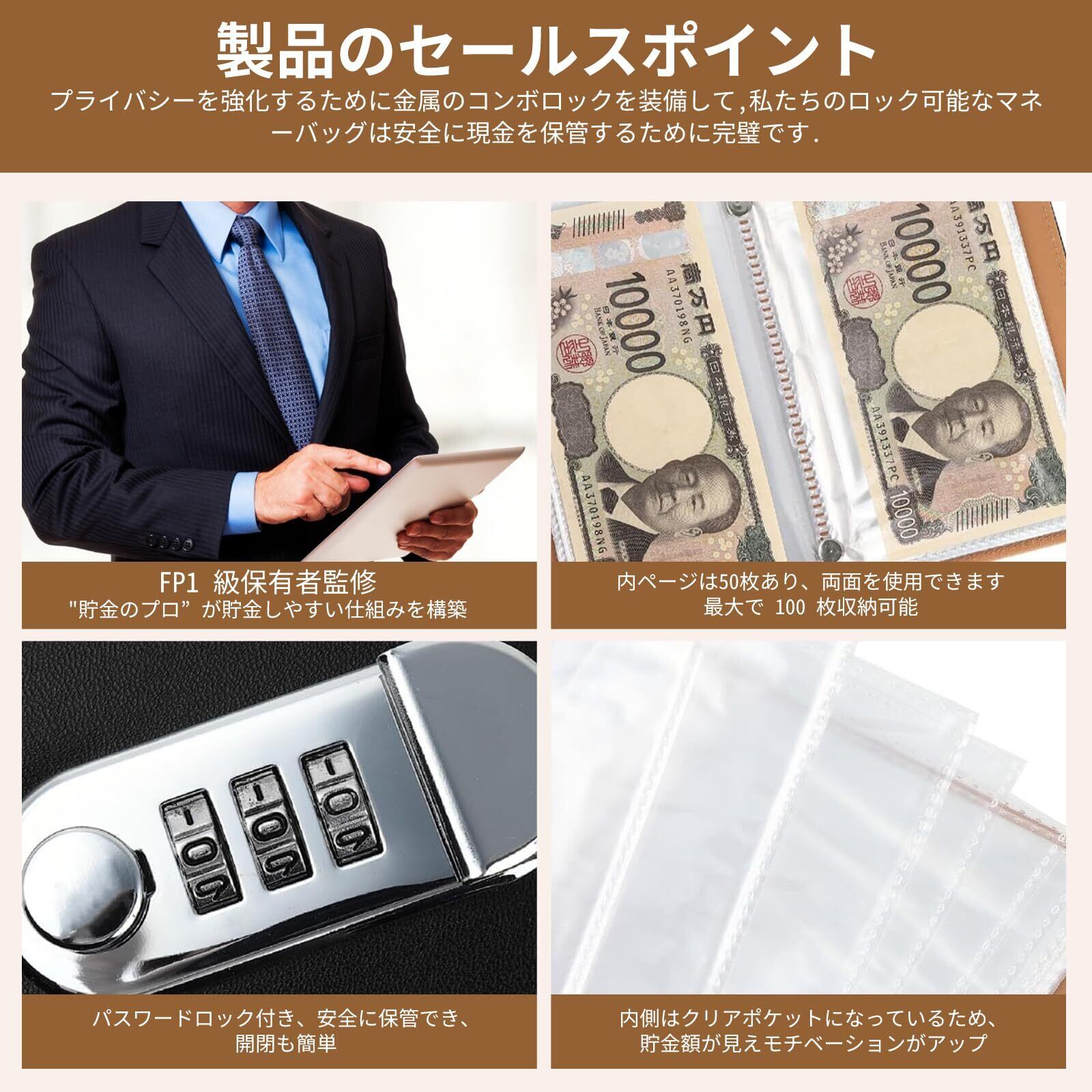 本品は、貯金を楽しく続けられるよう設計された多機能貯金バインダーです。 お札専用のポケットを備え、1万円札を100枚まで収納可能。セキュリティロック付きで、お金の安全性も確保。 内側には貯金計画表や進捗チェックシートも付属しており、目標達成をサポートします。 封筒貯金やお札管理など、さまざまな使い方ができるため、ご家族全員でお楽しみいただけます。 プレゼントとしても人気の高い一品です。