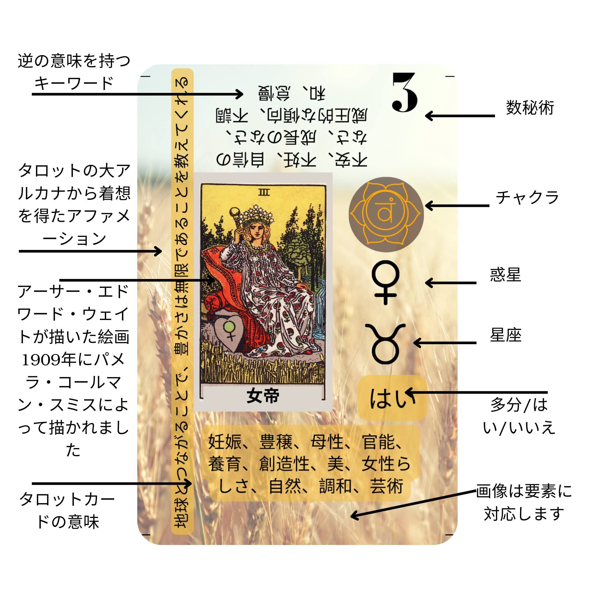 タロットカード - 初心者向けの初心者向けタロットカード キーワード 逆転 チャクラ 惑星 星座 要素 はいまたはいいえ アファメーション。 (日本語)