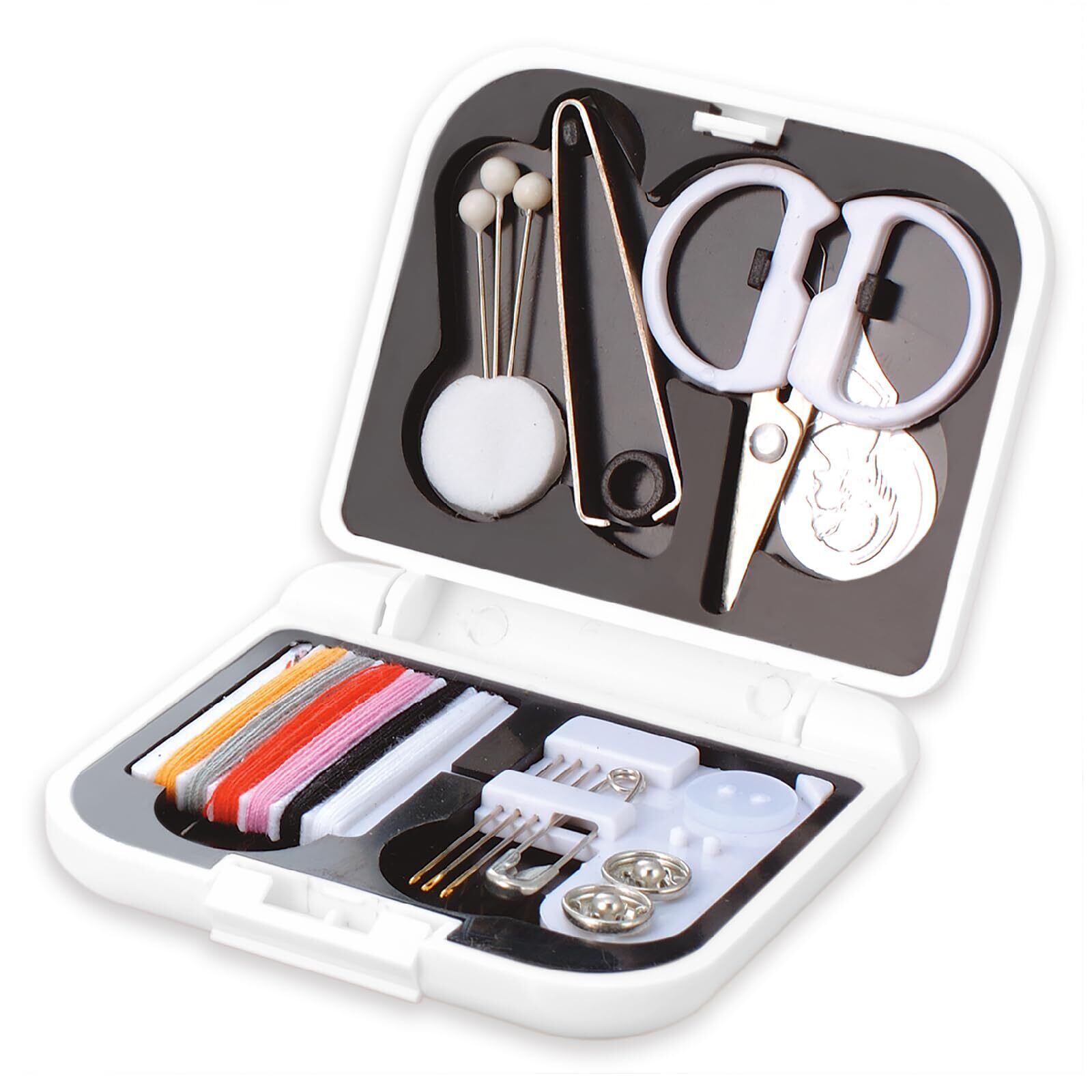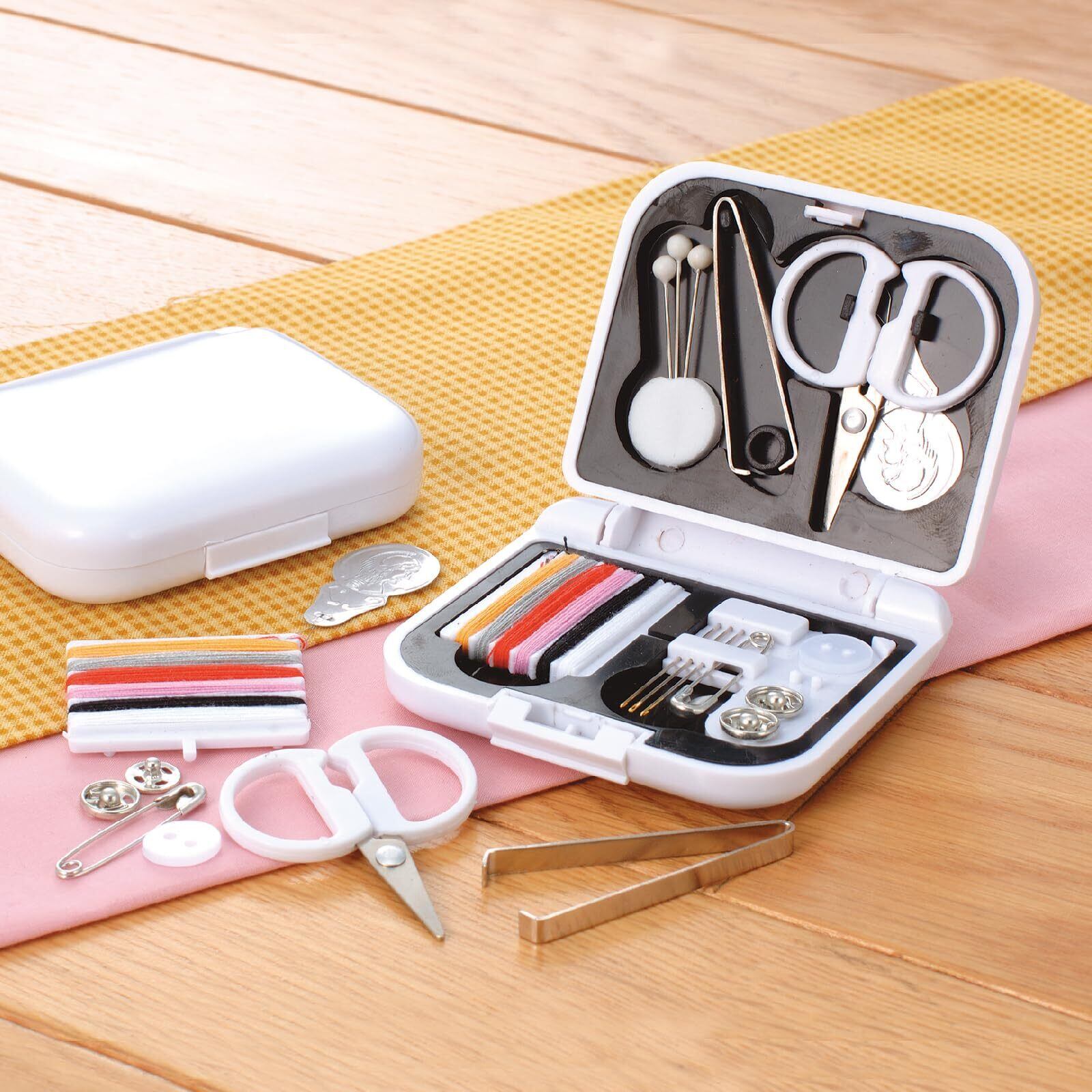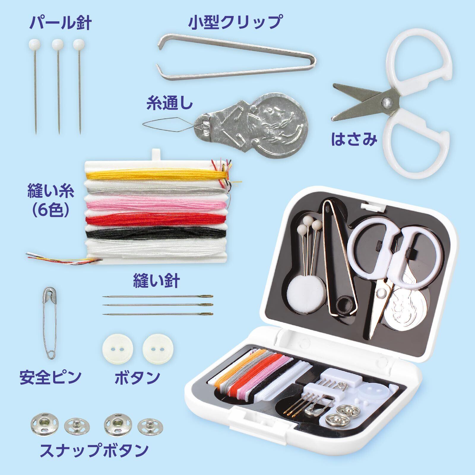 <セット内容>ミニはさみx1、糸通しx1、毛抜きx1、まち針x3、針x3、安全ピンx1、ボタンx2、スナップボタンx2、糸x6色