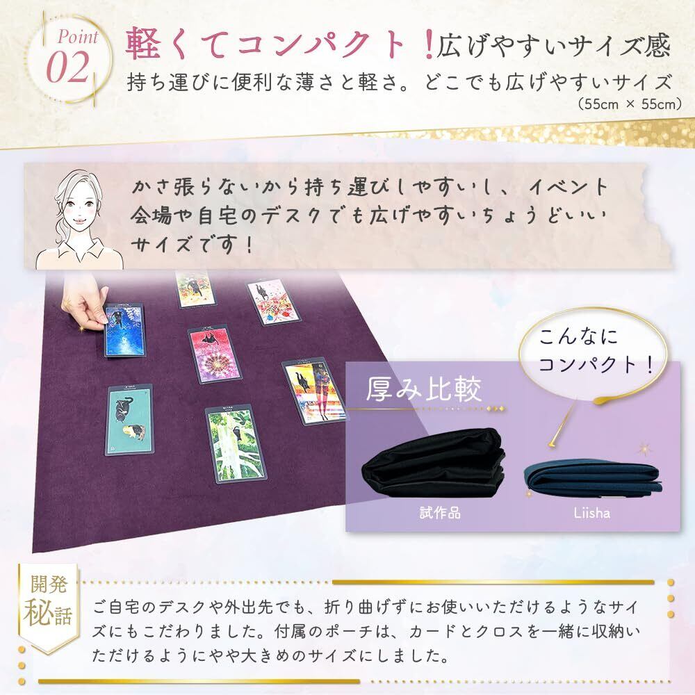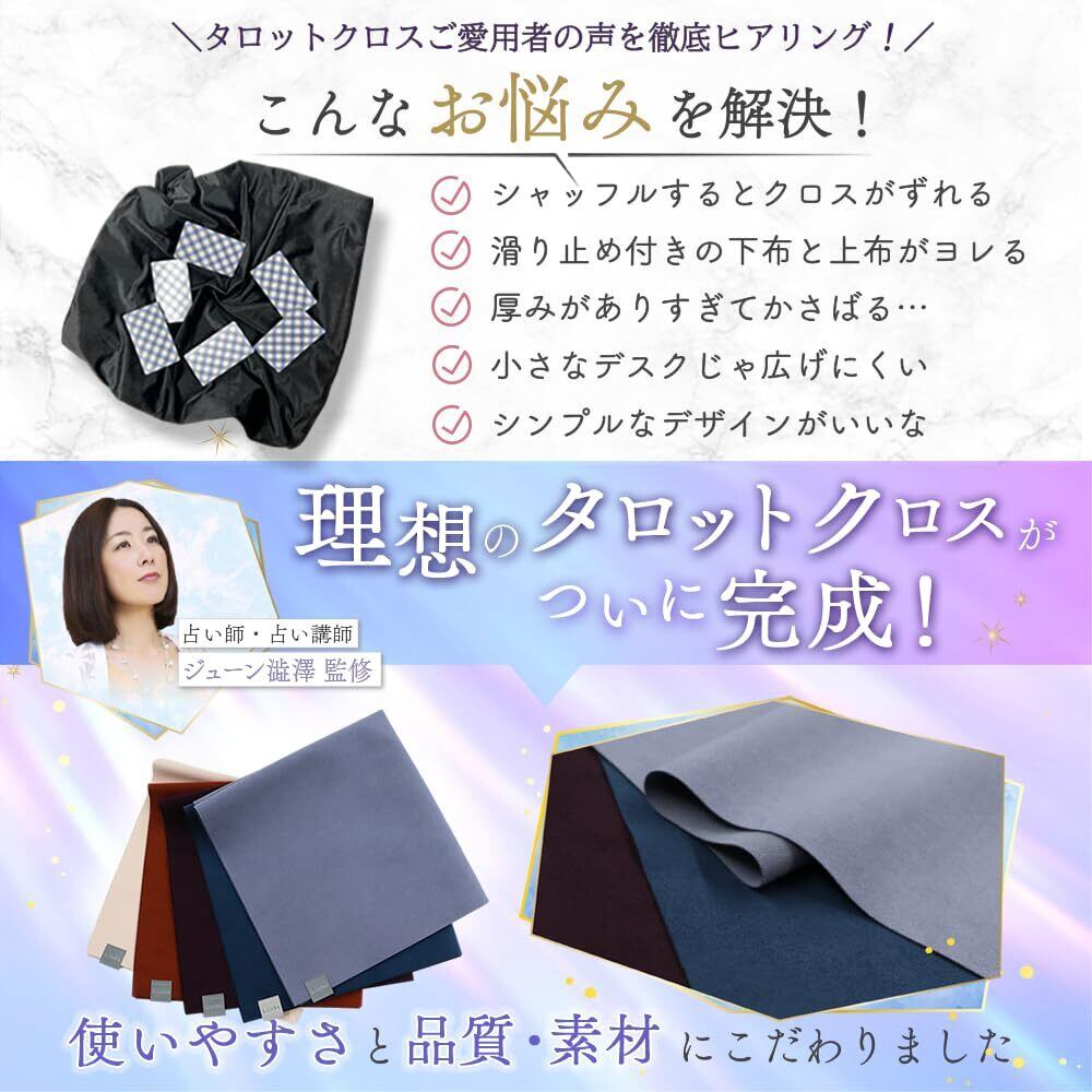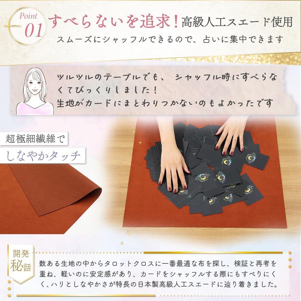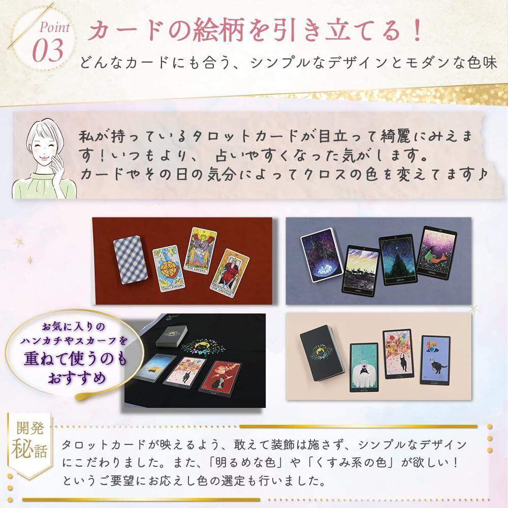 【抜群の安定感とシンプルなデザイン】 薄くて軽いのに、シャッフルのときは抜群の安定感。あえて装飾を一切施さないシンプルデザインは、タロットカードの絵柄をより一層引き立てます。また、大判のハンカチやスカーフなどをタロットクロスの上に重ねても安定するので、その日の気分やカードの雰囲気に合わせてお使いいただくのもおすすめです。