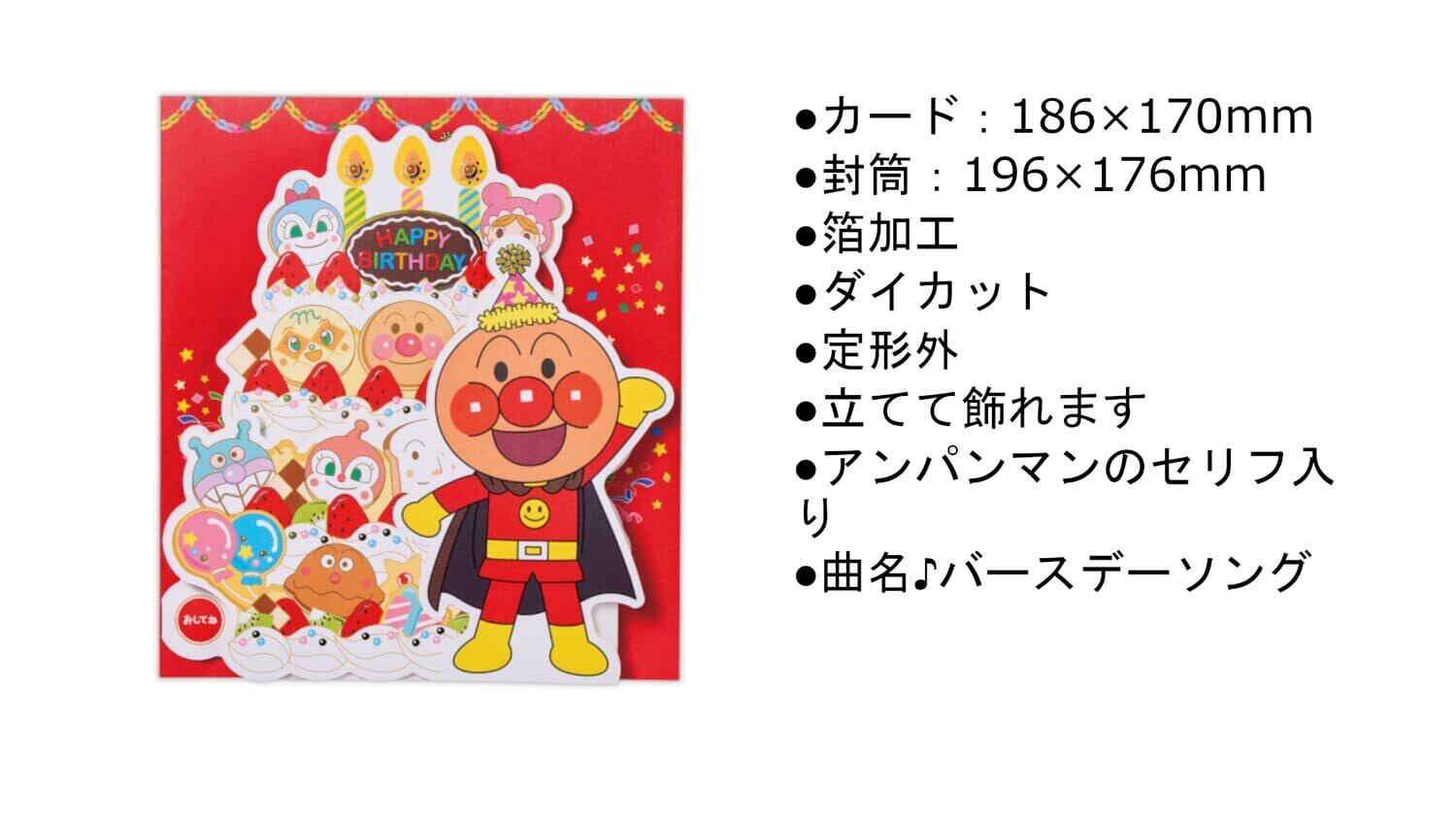 【特徴】大きなケーキとアンパンマンキャラクターたちが描かれたにぎやかなオルゴールカード。音楽に合わせてケーキのろうそく部分が光ります。アンパンマンのセリフ入り。
