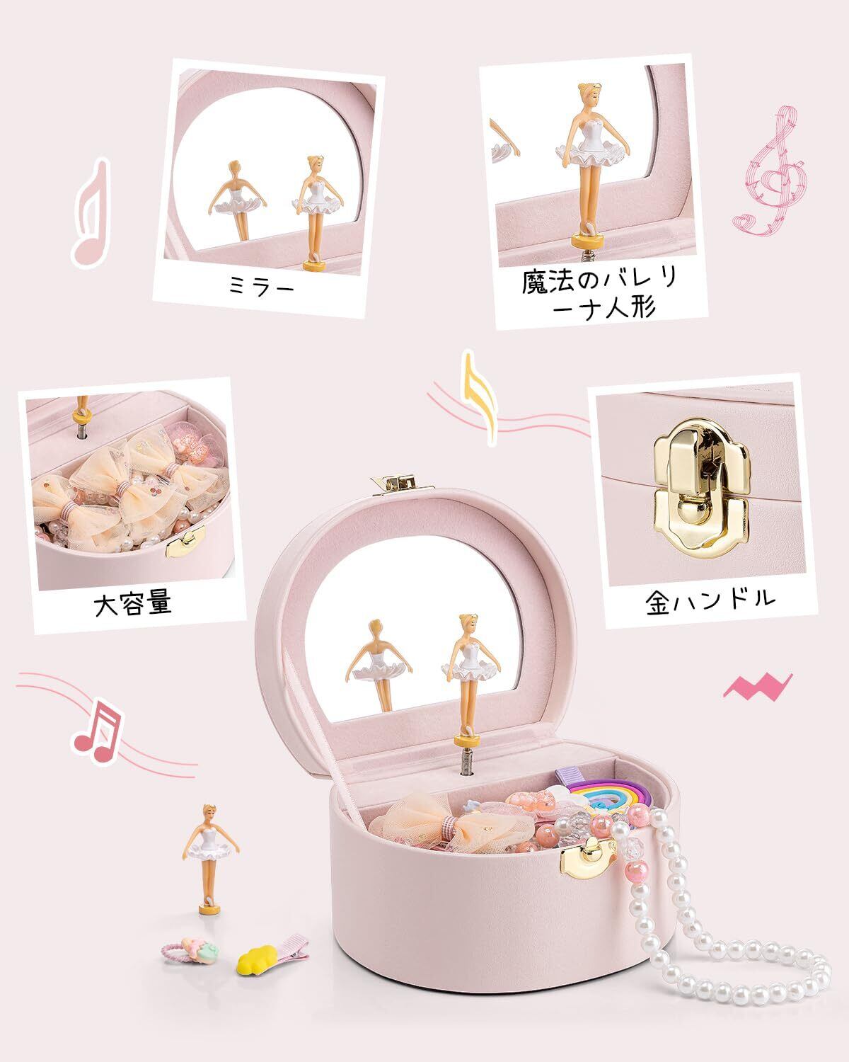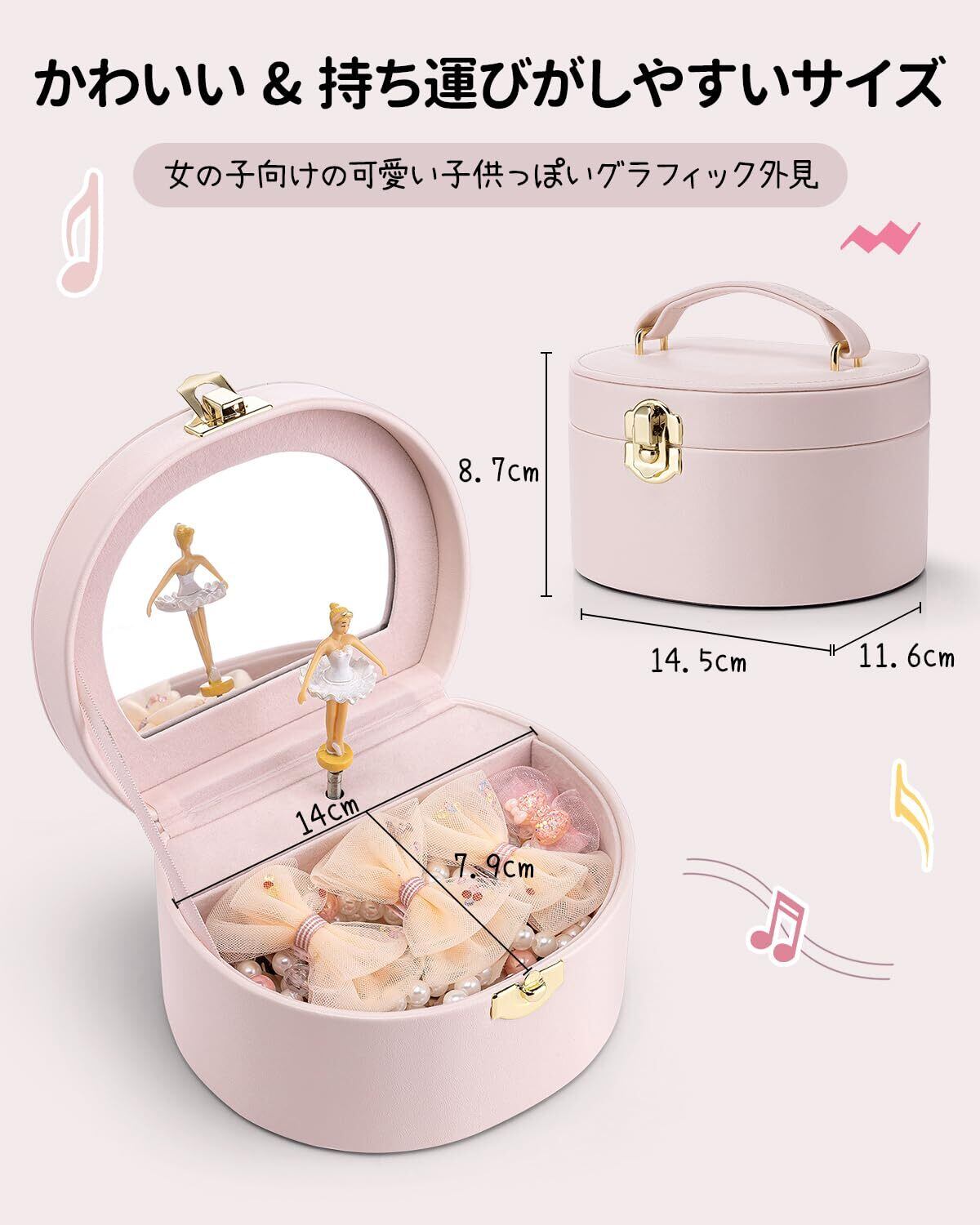 Vlando 誕生日プレゼント オルゴール 娘へのプレゼント ジュエリーボックス 半円形 鏡付き オルゴール プレゼント子供 携帯用 バレエ発表会 プレゼント プリンセス(ライトピンク)