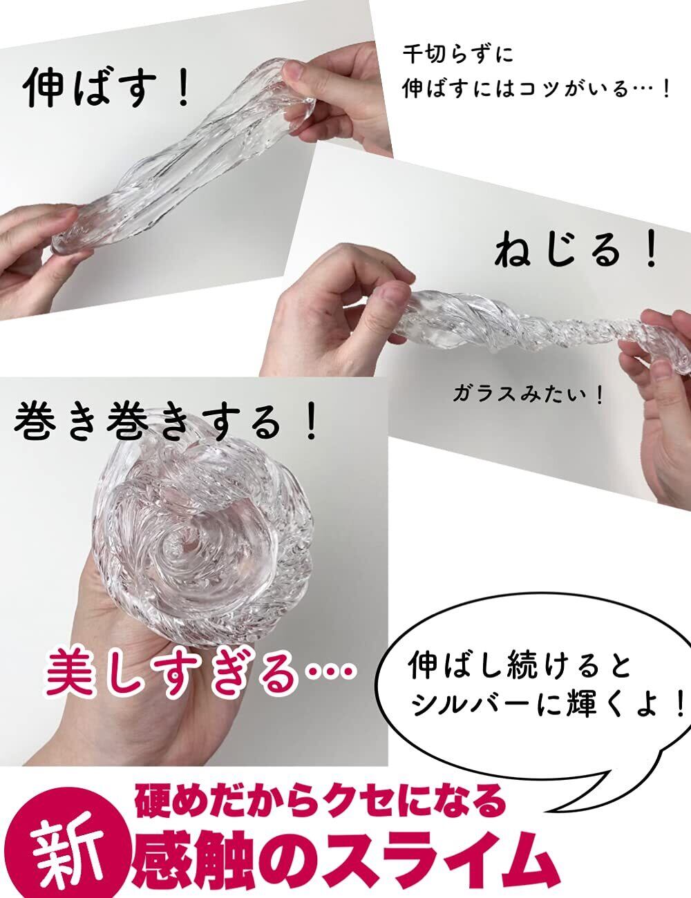 あなたはハンドガムスライムを触ったことがありますか?皆さんが知っているスライムとは違う少し硬めな不思議な感触! 伸ばすと透明なハンドガムが銀色に輝きます。空気を含ませて強く握るとバチバチ音が鳴ります。 それが最高に気持ち良い!でもそれにはちょっとコツがいります。あなたはバチバチ音を鳴らすことができるでしょうか? 繰り返し使用しているとホコリや手の汚れにより濁る場合がございますが品質に問題はございません。
