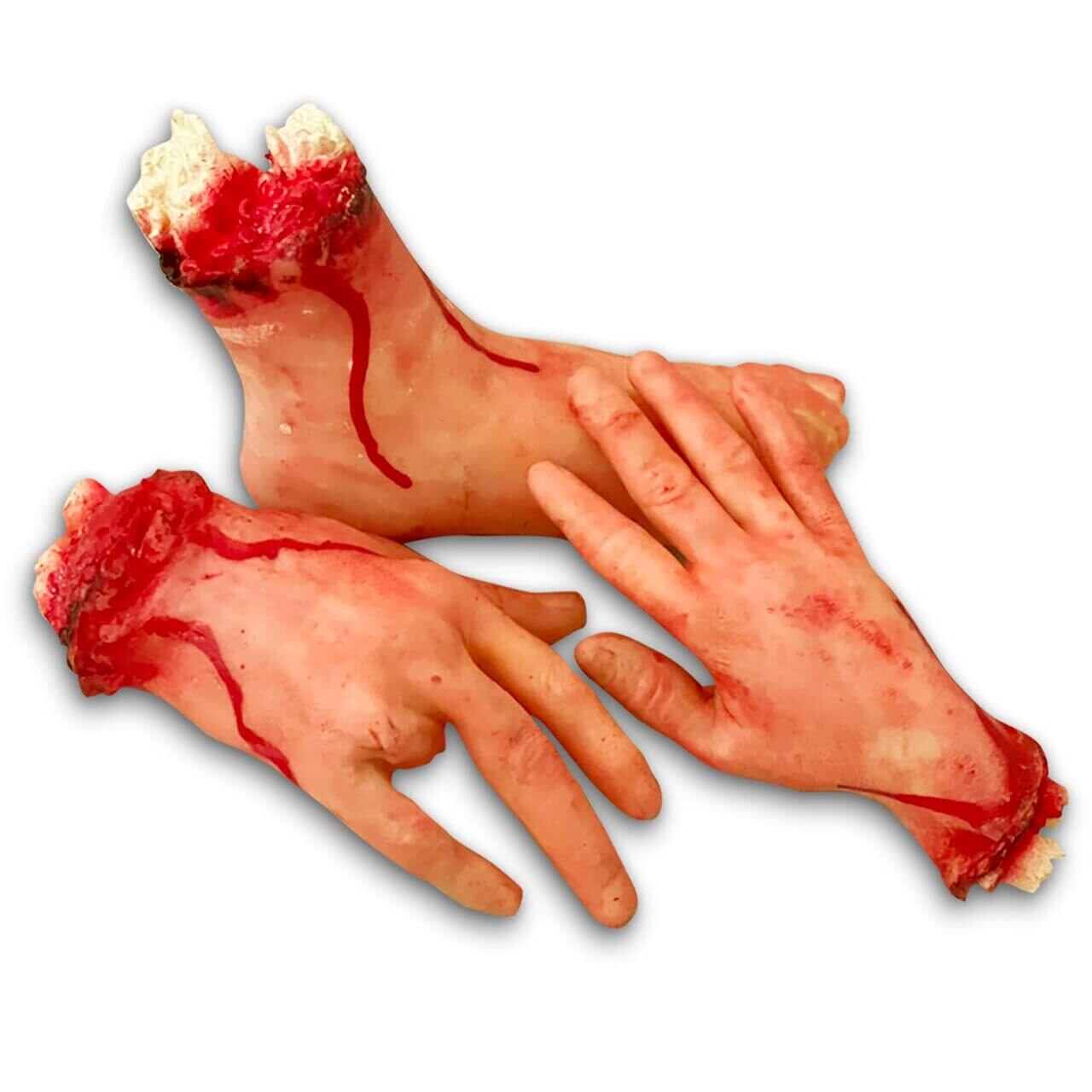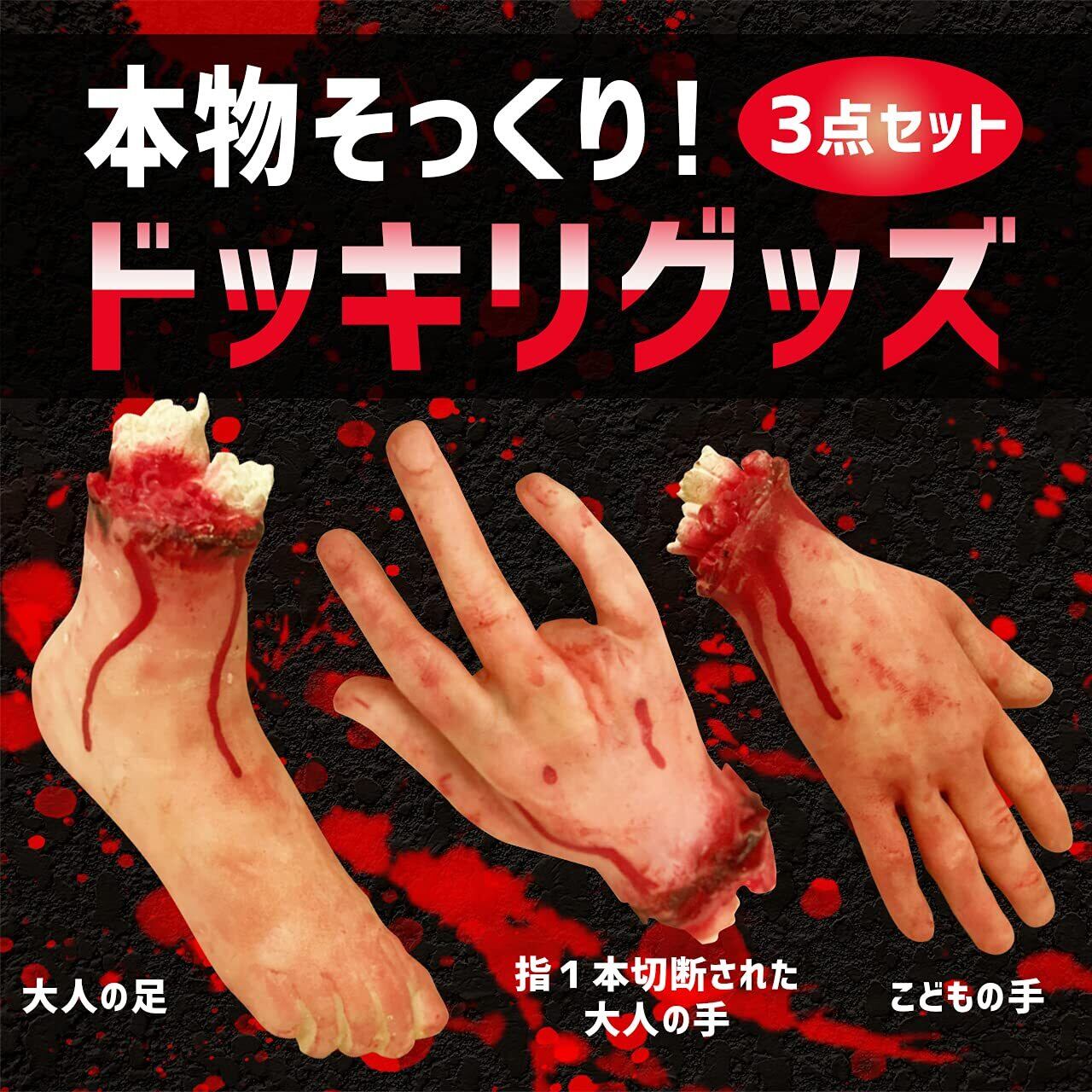 【セット内容】切断された手1個・肘まで1個・足1個の3点セットになります。心臓の弱い方やお年寄りの方、小さなお子様にはジョークで終わらない可能性もございますので十分ご注意ください。