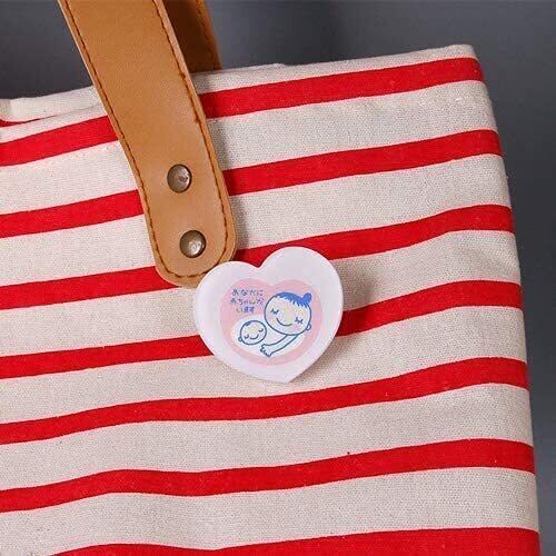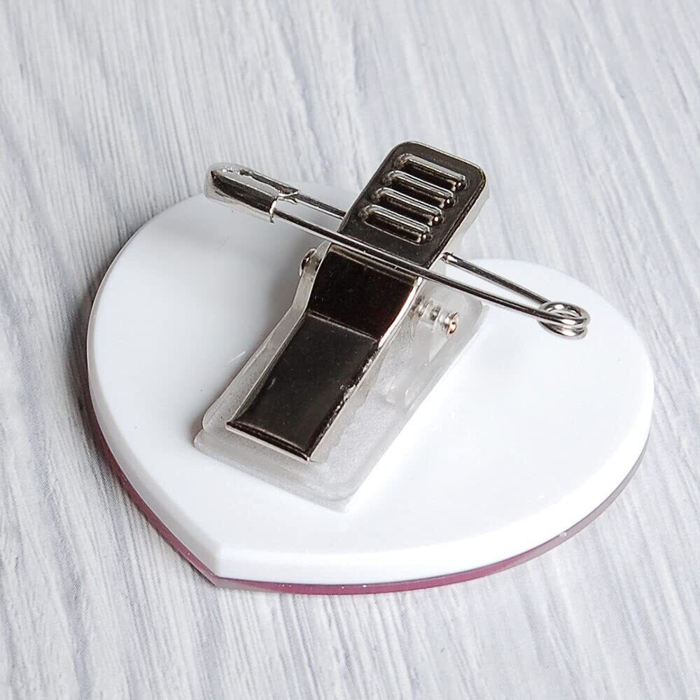 安全ピン付きクリップが付いているアクリル製のハート型マタニティバッジです。