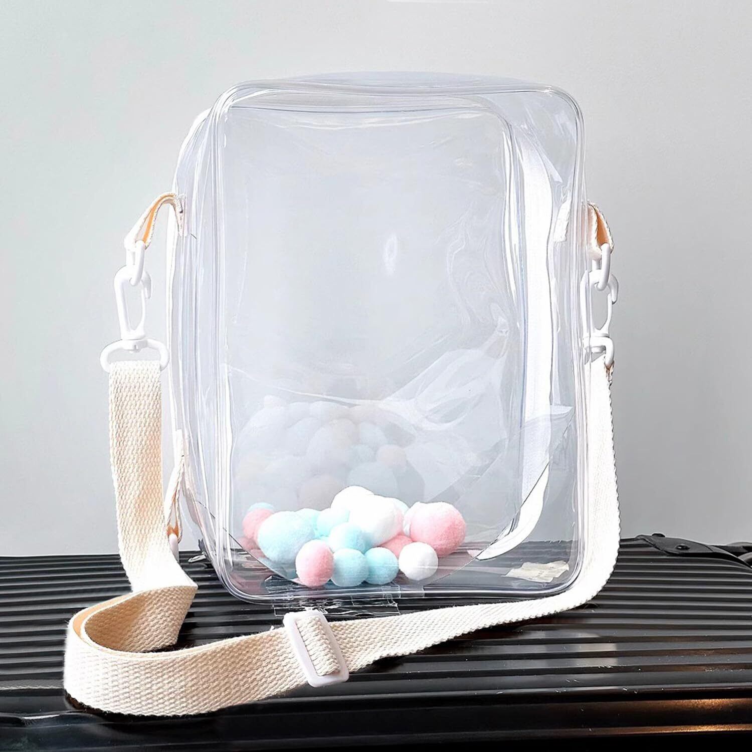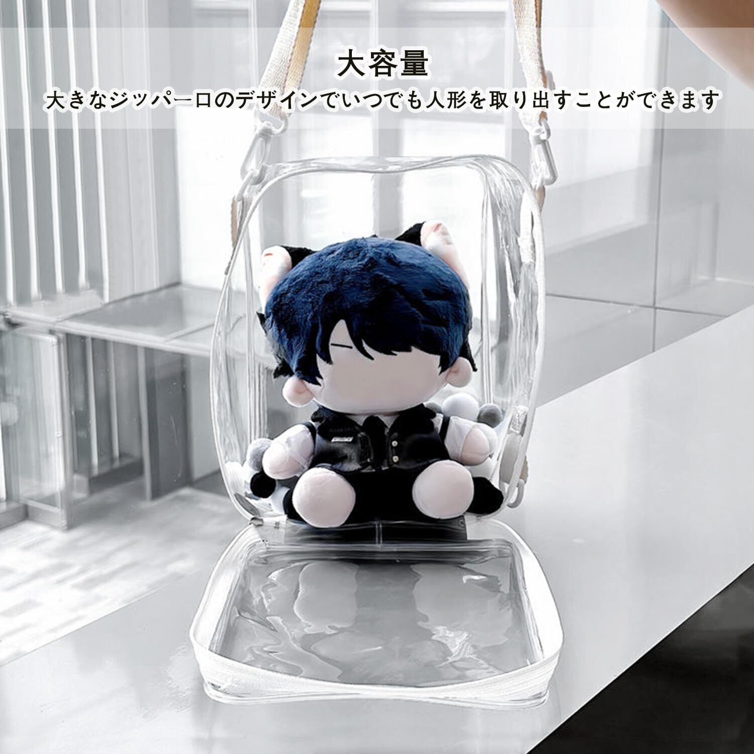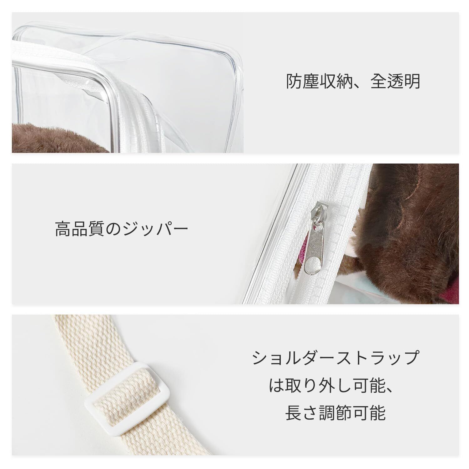 【外観】バッグは全面の透明クリアデザイン、内部に見せたいアイテムを好みにアレンジでき、防塵、水と塵からぬいぐるみなどを保護しくれます。四角い形バッグ、ジッパーのデザイン、ショルダーストラップ付き、取り外し可能、100cm長さは調節可能。2WAY:ショルダー式と斜めがけ式のバッグとして使えます。