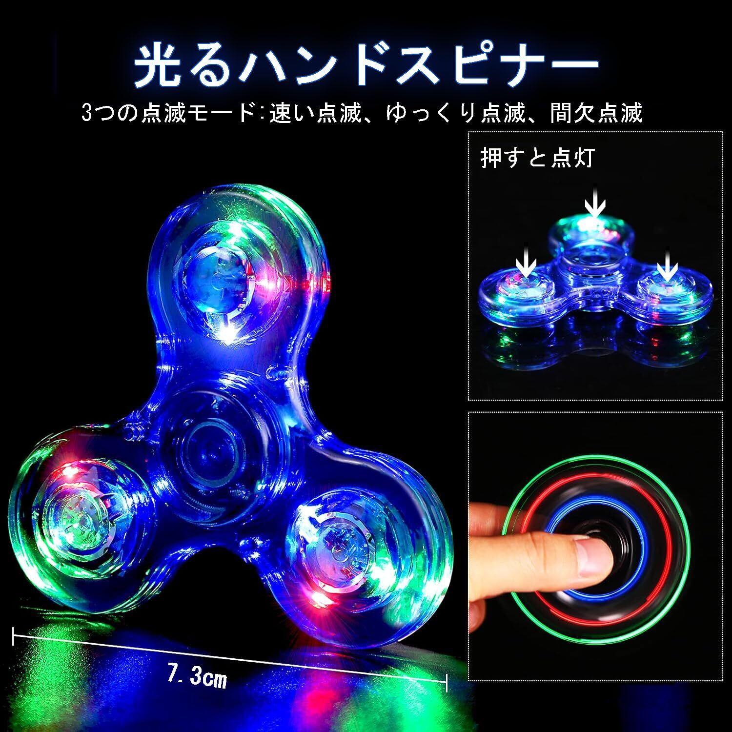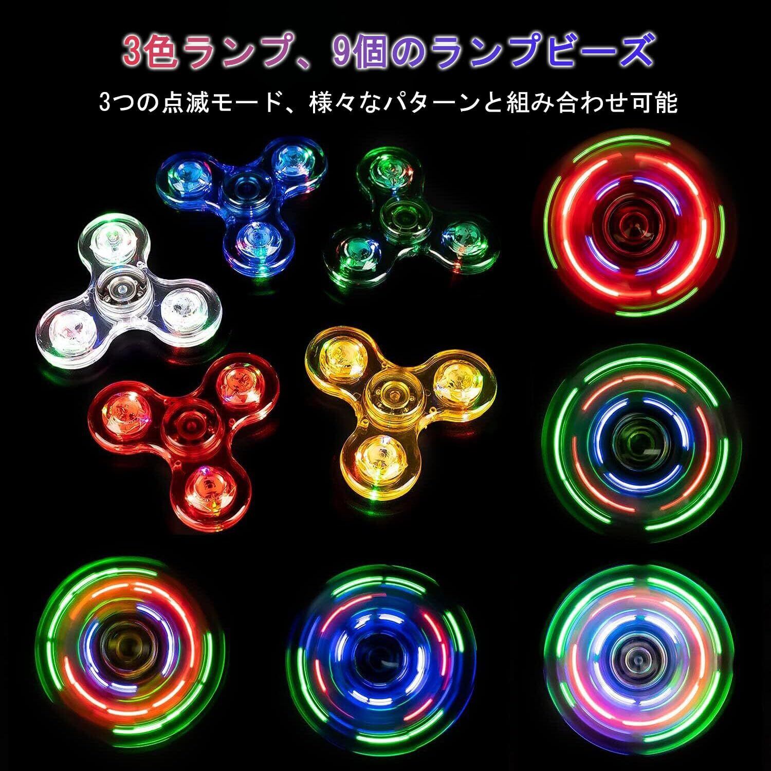【光る ハンドスピナー】ハンドスピナーの3つの角には、カラフルなLEDライトが内蔵されています。スピナーが回転すると、LEDライトが夜空の星のようにカラフルに発光します。 このユニークなライト効果は、視覚的な楽しみをもたらすだけでなく、パーティーやレジャーの際にも注目の的となります。