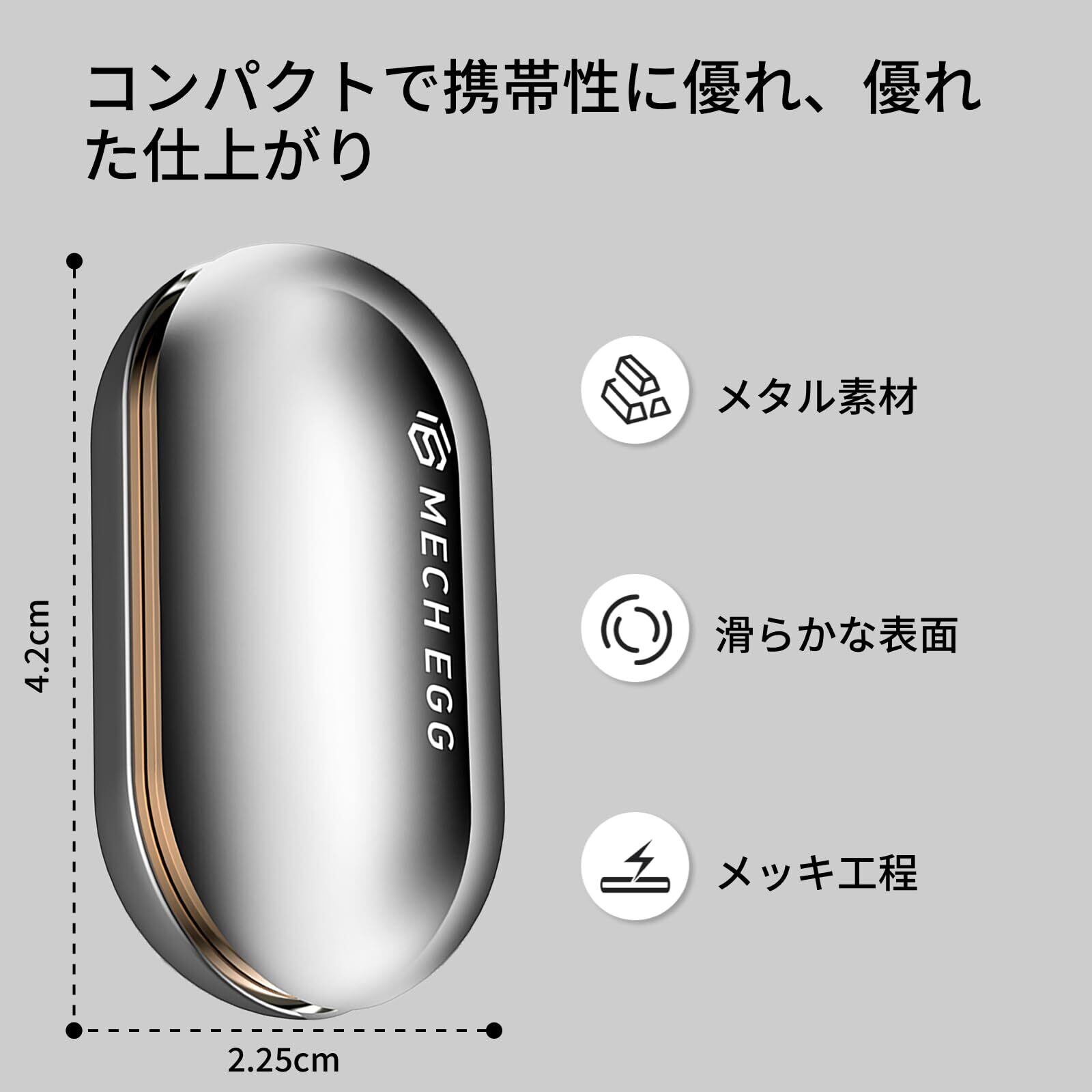 【メカエッグ・センサリートイ】高品質な亜鉛合金(メタルジンクアロイ)製で、3層構造デザインを採用。表面には12段階の電気メッキと焼付け塗装が施されており、色むらがなく、なめらかな手触りが特徴です。内部のテフロン加工により摩耗しにくい仕様です。