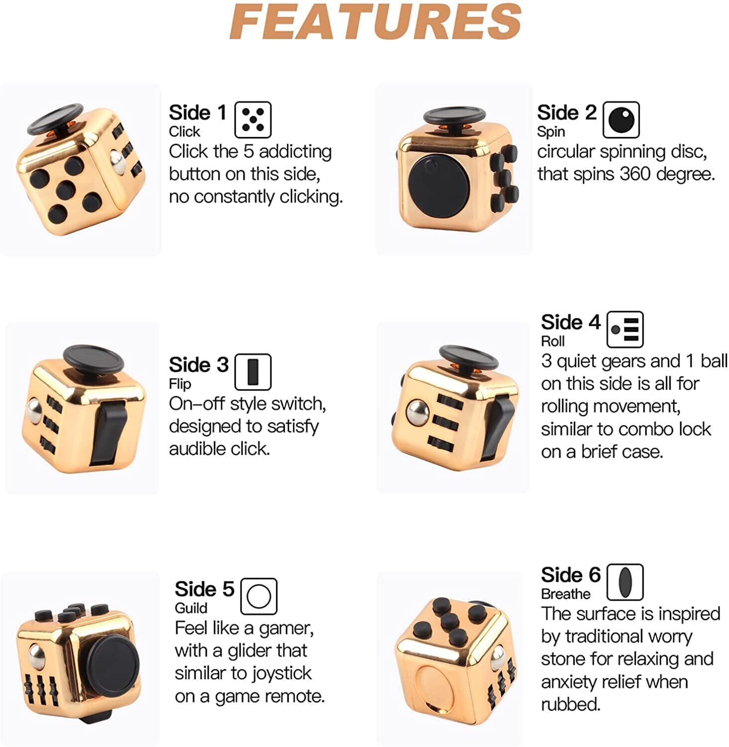 【多機能なグッズ】本体はサイコロ型で、8種類の機能を持っています。クリック(Click)、グライド(Glide)、フリップ(Flip)、ブレス(Breathe)、ロール(Roll)、スピ ン(Spin)。