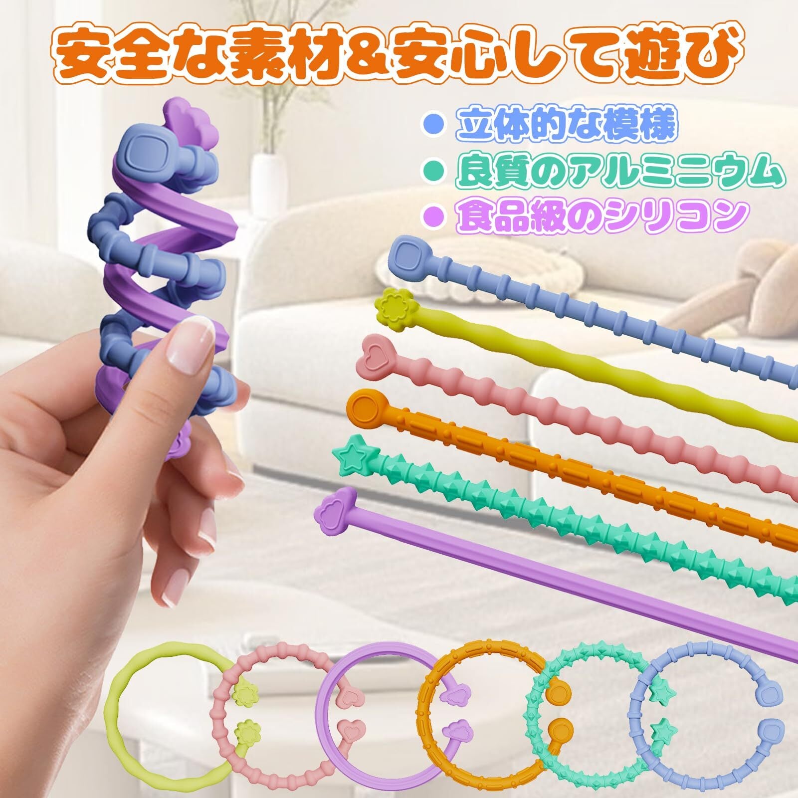 【安全な素材】感覚石おもちゃの内部は上質なアルミ糸で、折り曲げに強いです。外側は無毒のシリコン製なので、丈夫で、においもしません。子供が遊んでも心配ありません。掃除が簡単で、持ち運びも簡単で、家庭、オフィス、旅行の頼もしいパートナーです。