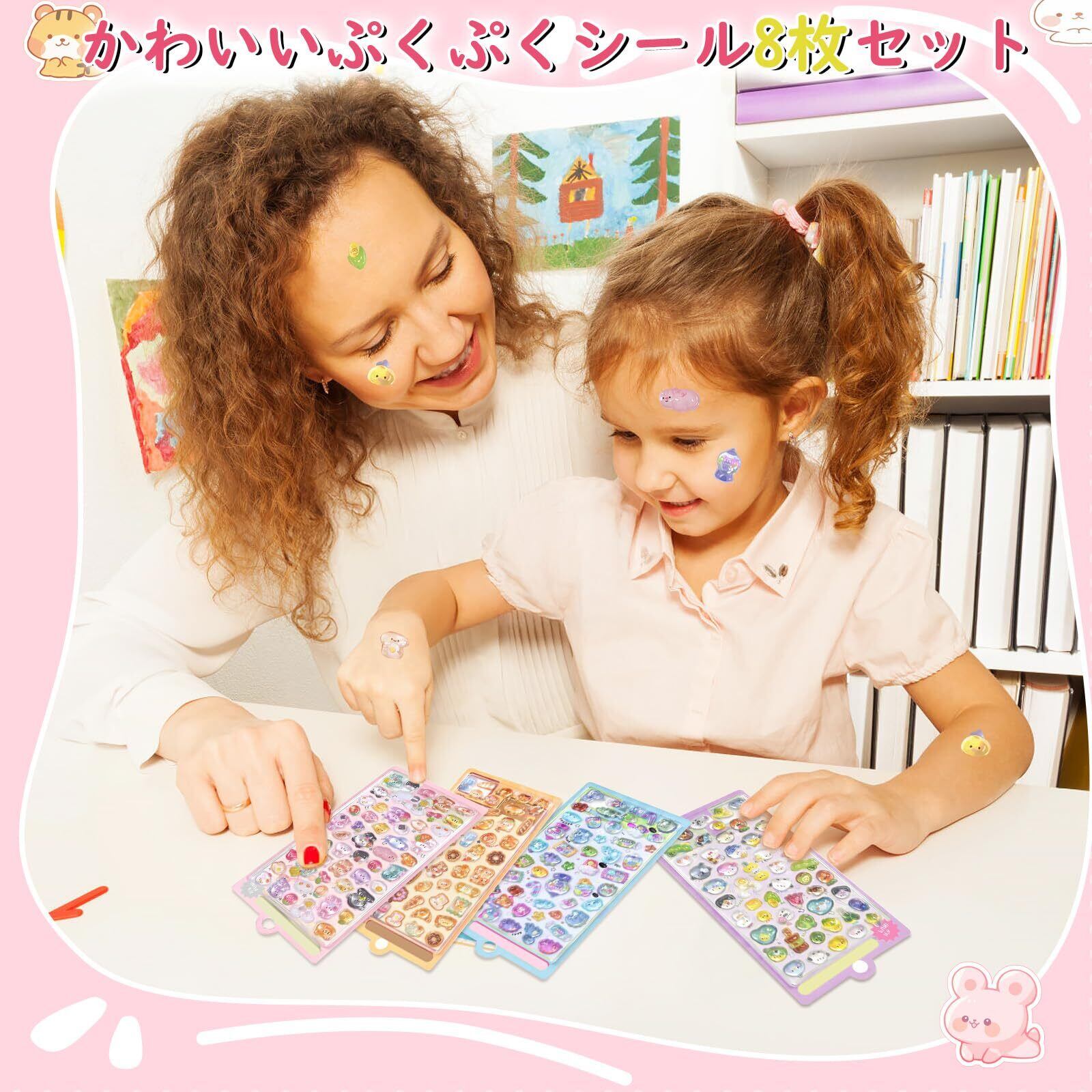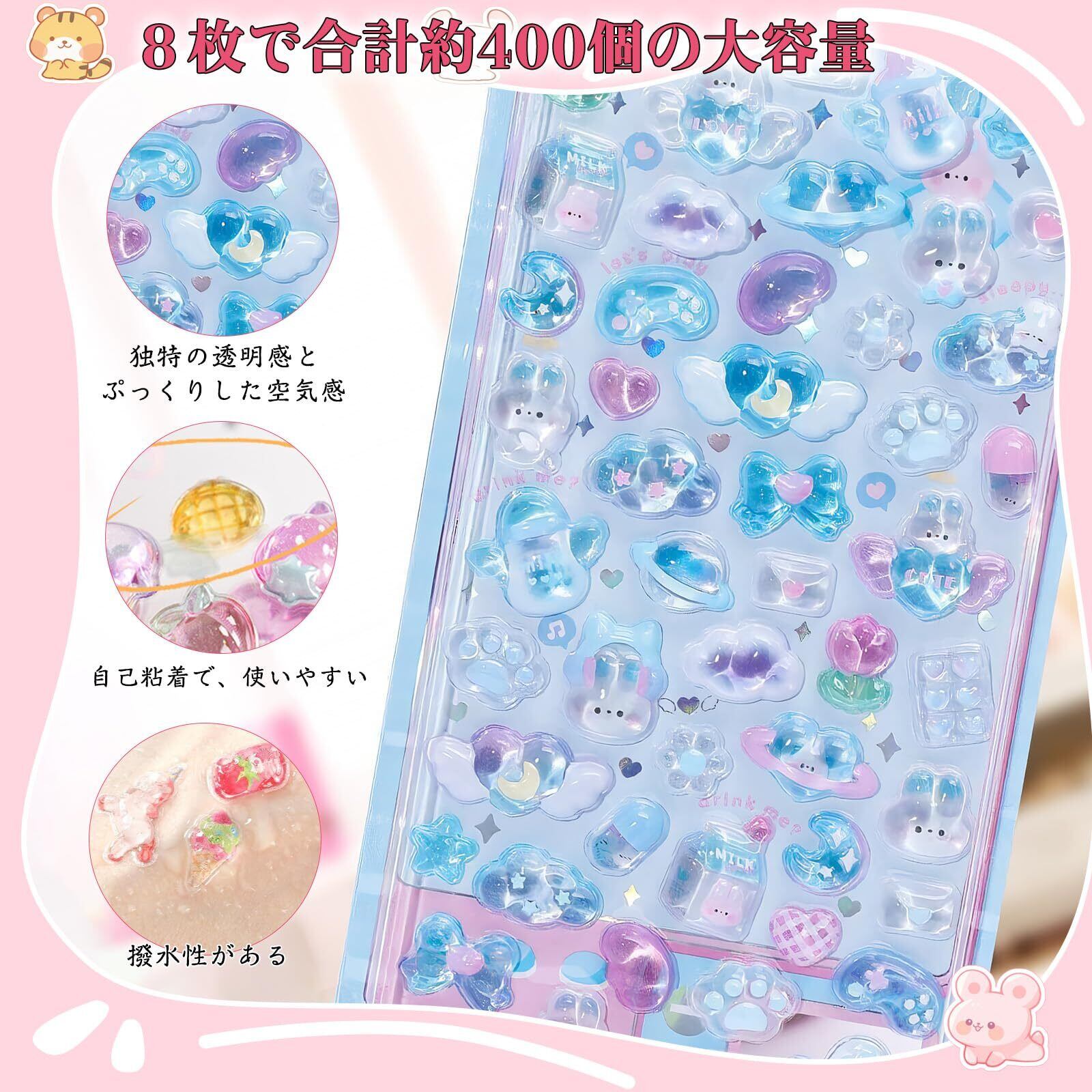 【大容量】8枚のぷっくりシールセットで、1枚あたり約50個の立体ステッカーがあり、合計約400個の大容量です。デザインもそれぞれ異なるので、存分に楽しめます