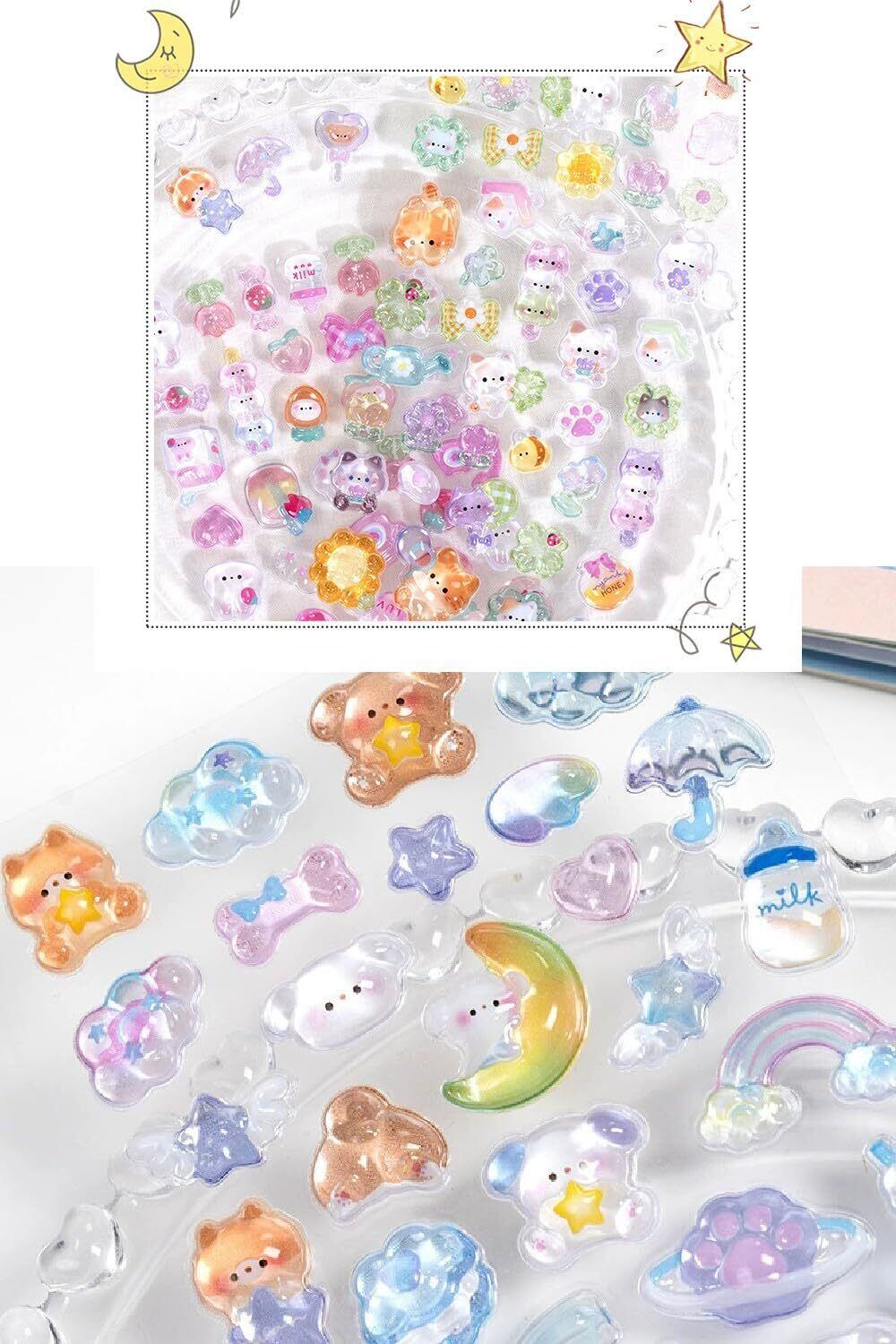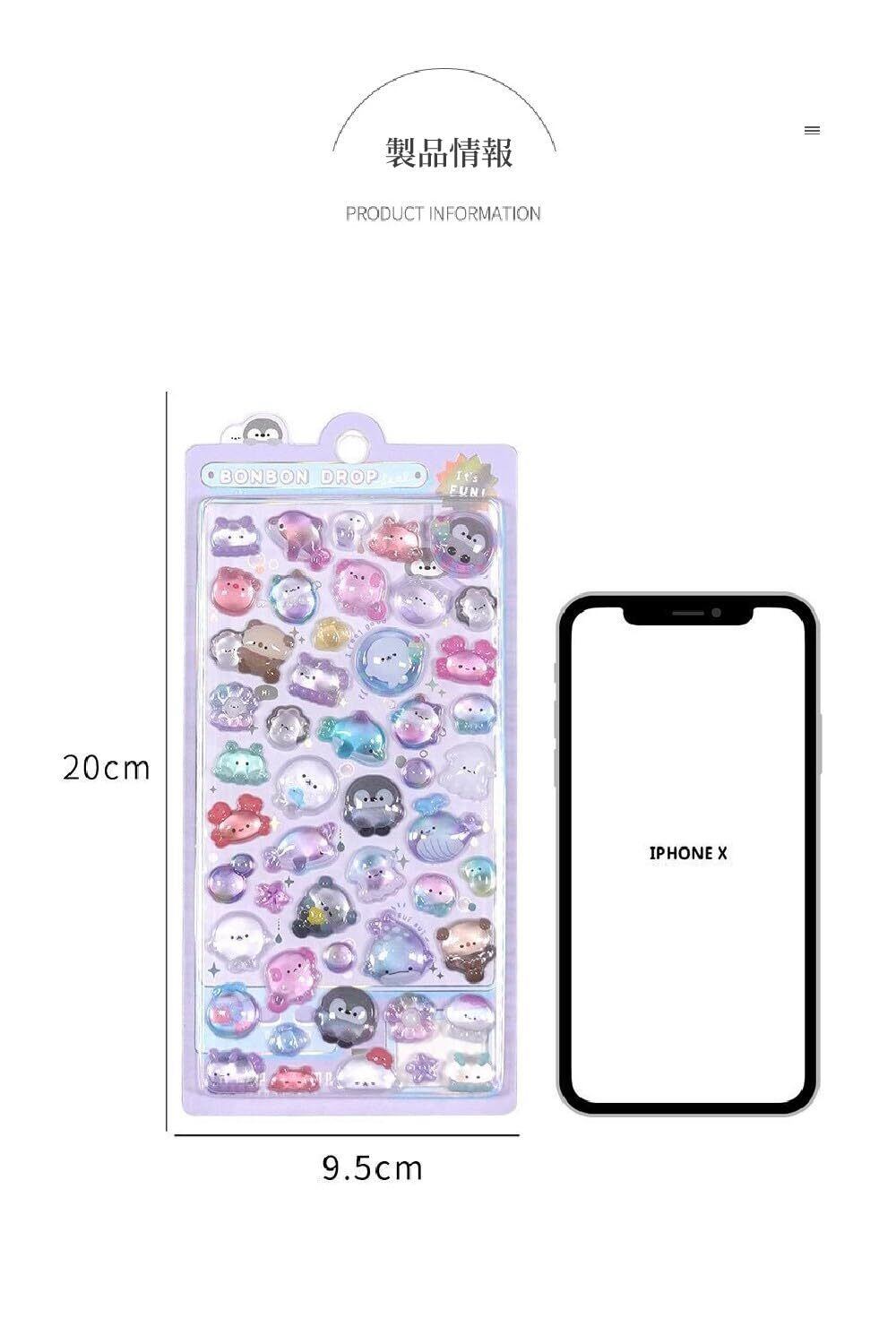 豊富なデザイン: 可愛い動物やスイーツをモチーフにした立体シールが。淡いパステルカラーとキラキラ光るエポキシ樹脂が女の子に大人気。