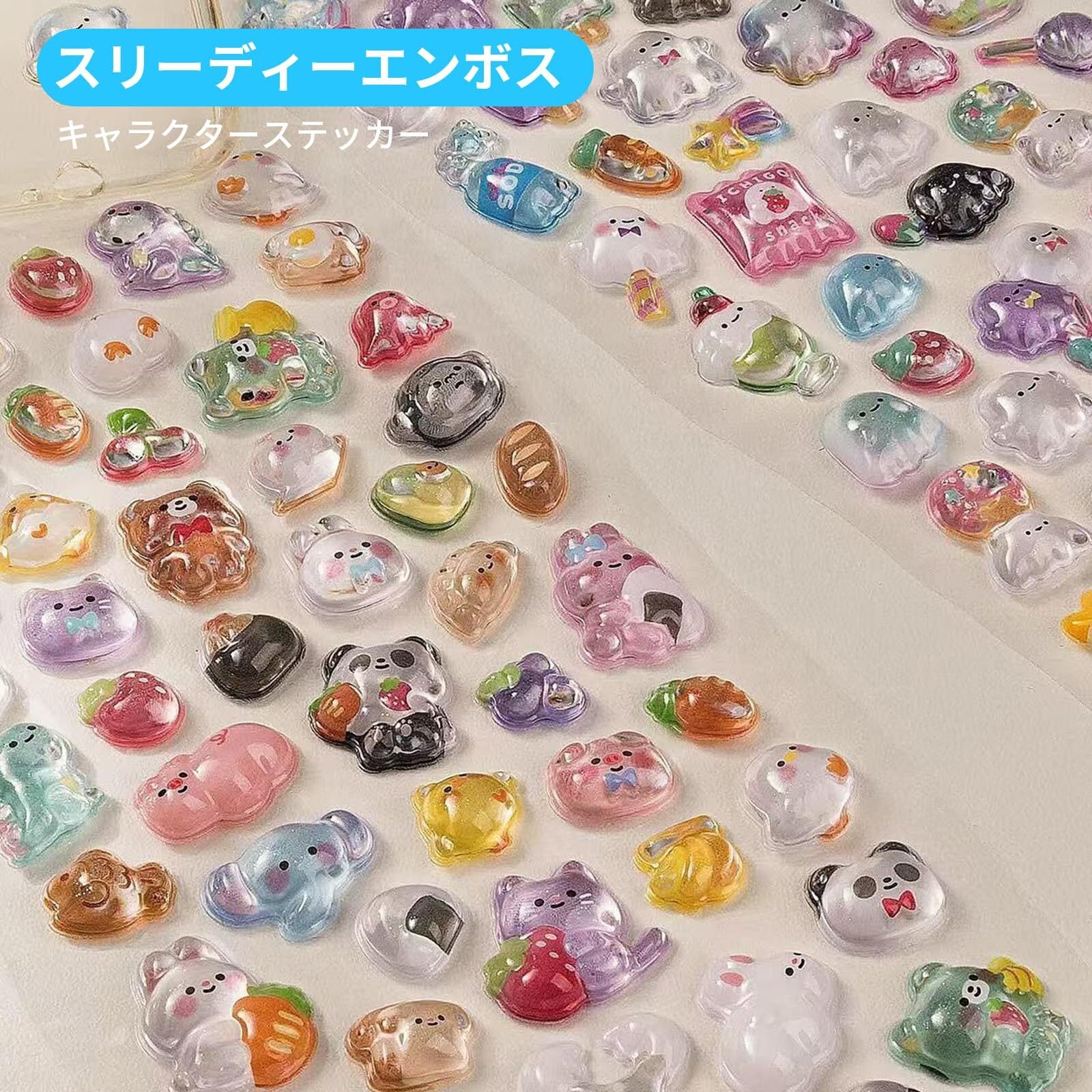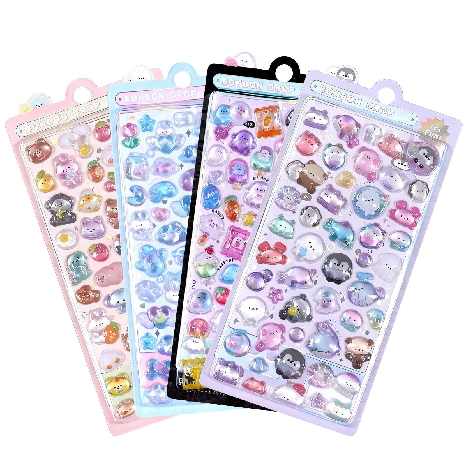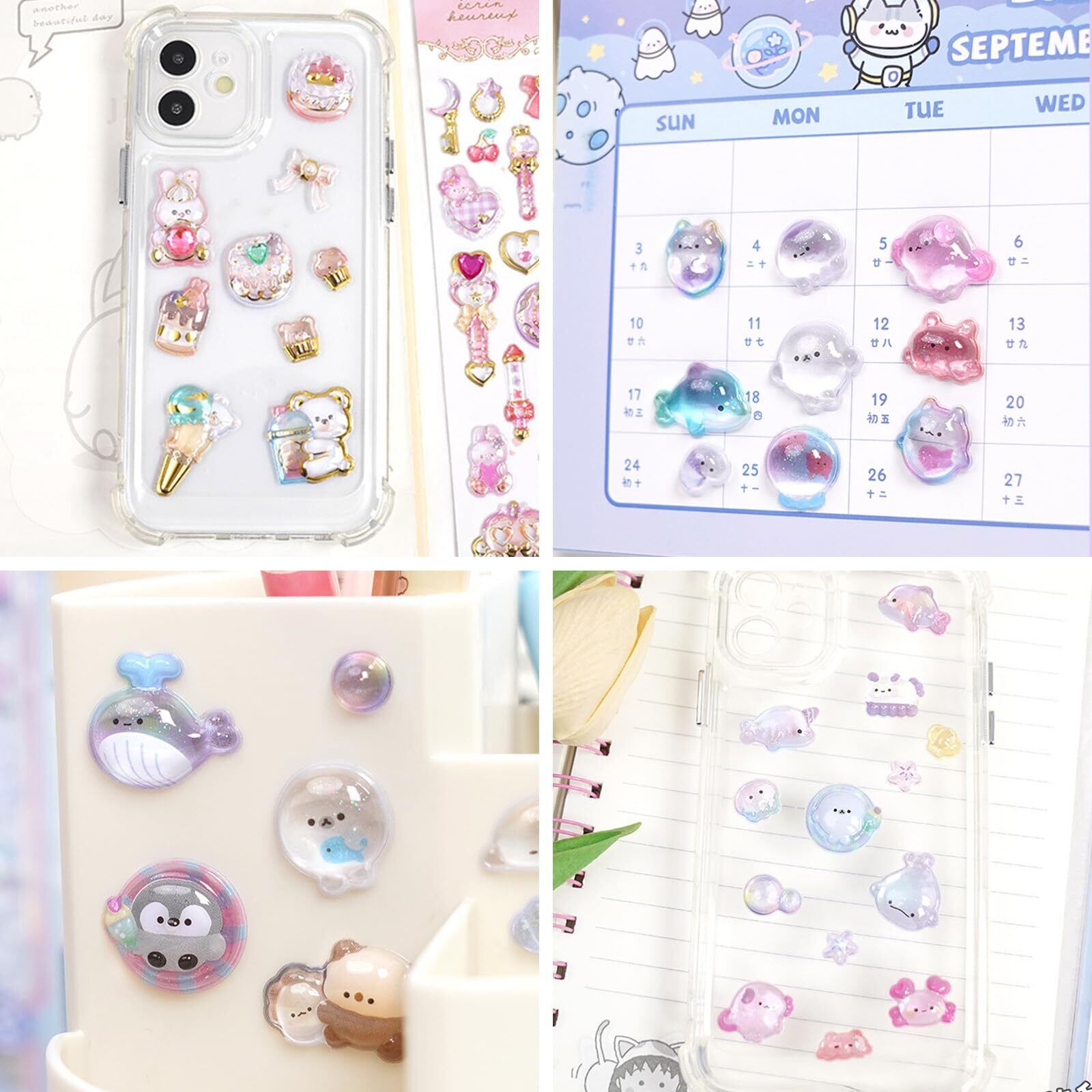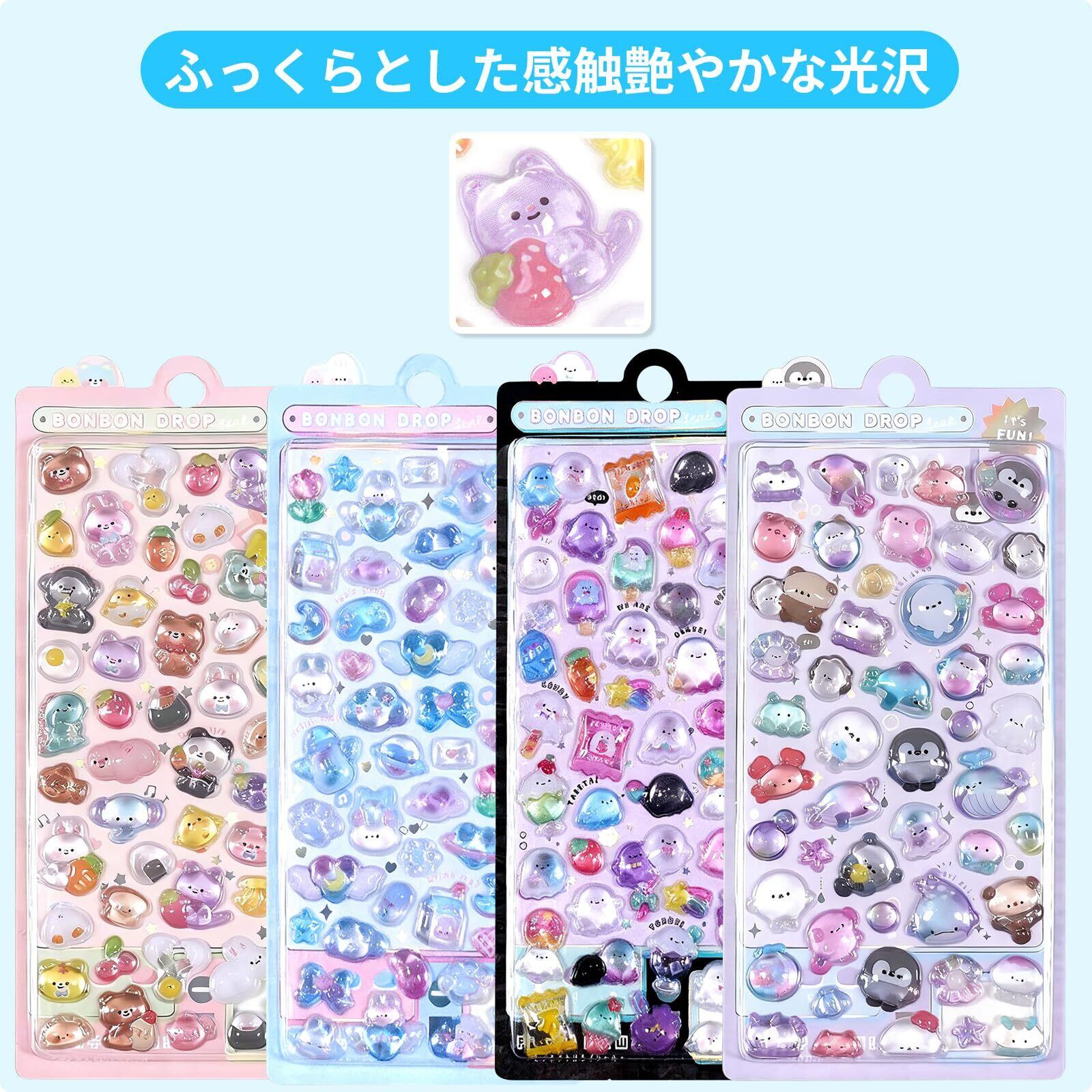 【4枚セット】3dシール 立体シール 可愛い ぷくぷく Lucktree ジュエル風 立体 泡ステッカー ステッカー 手帳用 貼り付け可能 女の子 (動物 + 翡翠のウサギ + 雲 + 海)
