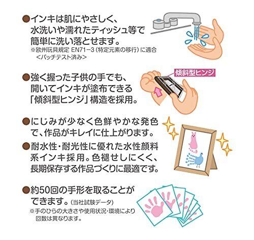 手形スタンプ PALM COLORS ■商品説明 手形スタンプパッド「パームカラーズ」は、お子さまの成長記録をかわいく、キレイに残せる手形・足形専用のスタンプパッドです。 肌にやさしくお子さまにも安心なインキを使用し、水洗いや濡れたティッシュなどで簡単に洗い落とすことができます。 また、耐水性・耐光性に優れた水性顔料系インキにより、色褪せしにくく長期保存する作品づくりに最適です。インキ色は、やさしい雰囲気に仕上がる淡いパステル系の全10色を揃えています。 さらに、手をぎゅっと握りがちな赤ちゃんの手を開かせる「傾斜型ヒンジ」構造の採用により、簡単に手の平にインキを塗布できます。 本商品は、株式会社petapeta 代表で手形アート作家のやまざきさちえ氏に監修いただきました。 ■商品特徴 ・肌に優しく耐水性・耐光性に優れた水性顔料系インキ インキは肌にやさしく、水洗いや濡れたティッシュ等で簡単に洗い落とせます。 また、耐水性・耐光性に優れた水性顔料系インキを使用しており、色褪せしにくく、長期保存する作品づくりに最適です。にじみが少なく色鮮やかな発色で、作品がキレイに仕上がります。 ※約50回の手形を取ることができます。(当社試験データ) ※欧州玩具規定 EN71-3(特定元素の移行)に適合しています。<パッチテスト済み> ※インキ補充はできません。 ・傾斜型ヒンジ構造 手をぎゅっと握って手形を取るのが難しい赤ちゃんの手をさっと開かせ、より手形を取りやすい「傾斜型ヒンジ」構造を採用。 ●画像はお客様の環境により、実際の商品と色が若干異なる場合がございます ■盤面(スタンプ部分)サイズ/8×8センチ (商品サイズ/W9.58×D10.02×H2.15センチ)