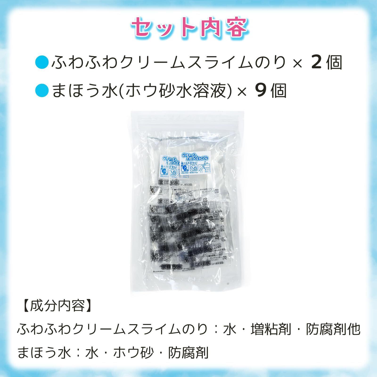 【セット内容】ふわふわクリームスライムのり×2個、まほう水(ホウ砂水溶液)×9個