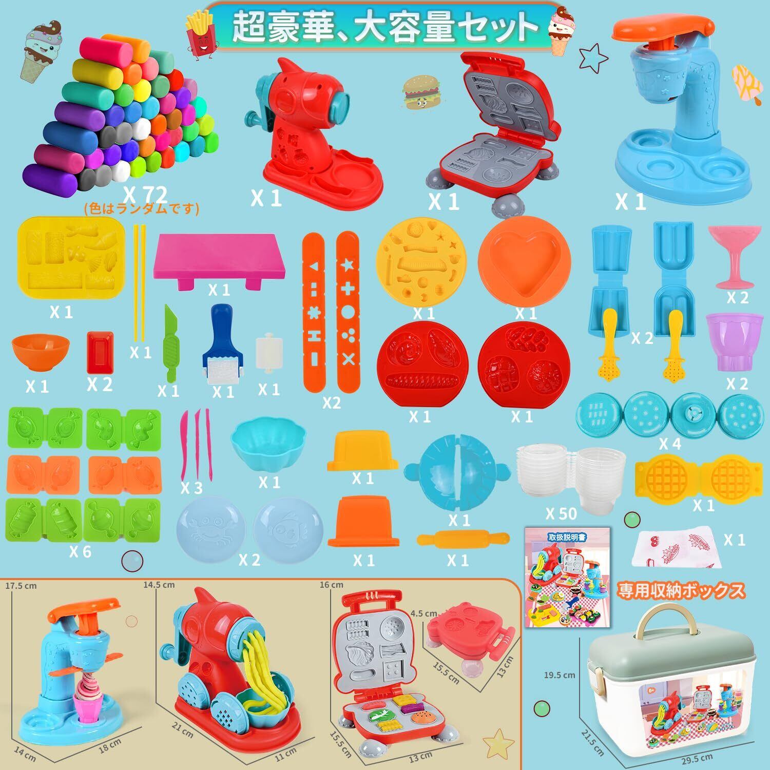 【超豪華、大容量セット】72個の小麦粘土、楽しい型や器(アイスクリームマシン、製麺機、パン焼き機、寿司型など、カラーランダム)、空のプラスチックカップ50個、高品質の収納ボックス1個、説明書の日本語(挿し絵はついています)。 大充実のねんどおもちゃセット。遊び方次第でカラフルで面白い粘土細工が楽しめます。