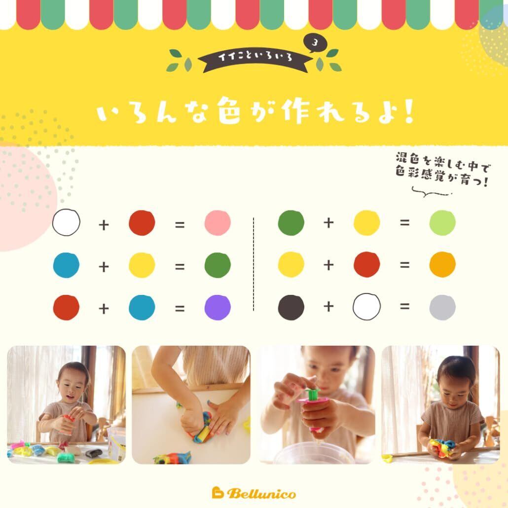 【色がキレイ!!】ベルニコの小麦粘土は発色が良く創造力を刺激。混ぜ合わせることで様々な色を作り出すことができます。