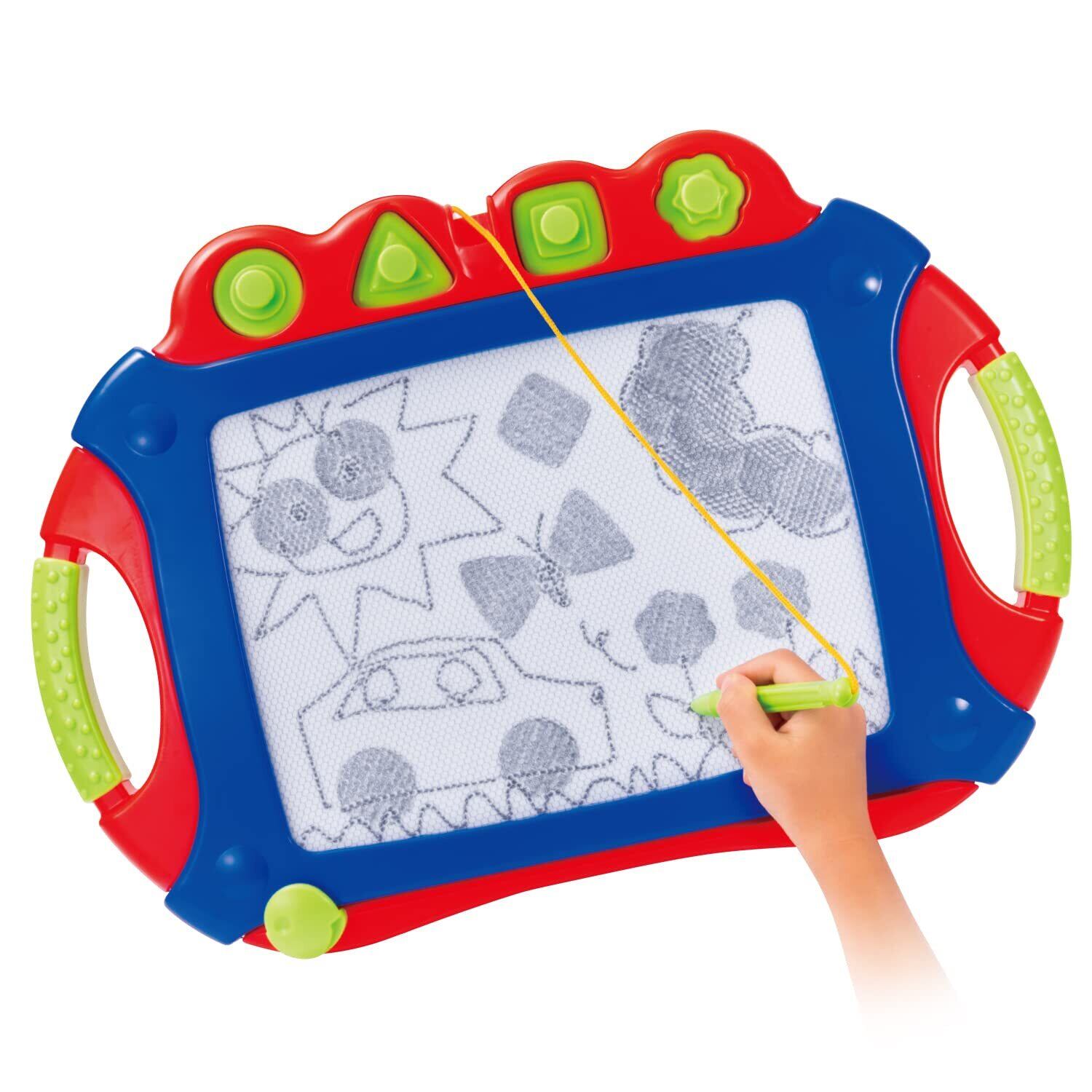 描いて消していっぱい遊べるお絵かきボード。付属のおえかきペンやマグネットスタンプでおえかきしよう。レバーを左右にひくと絵が消えるよ。