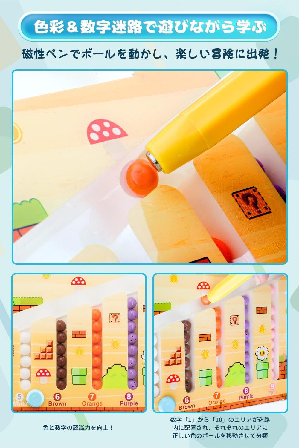 【知恵を試す迷路ゲーム】裏面には数字1から10までが記載されたカラフルな迷路を搭載。異なる色の磁気ビーズを磁性ペンで動かし、障害物を避けながら正しいエリアに分類します。遊びの中で色と数字の対応関係を学び、論理的思考力や問題解決能力を養うことができます。この迷路ゲームは、子供たちに「楽しさ」と「学び」を同時に提供する、教育的価値の高いコンテンツです。