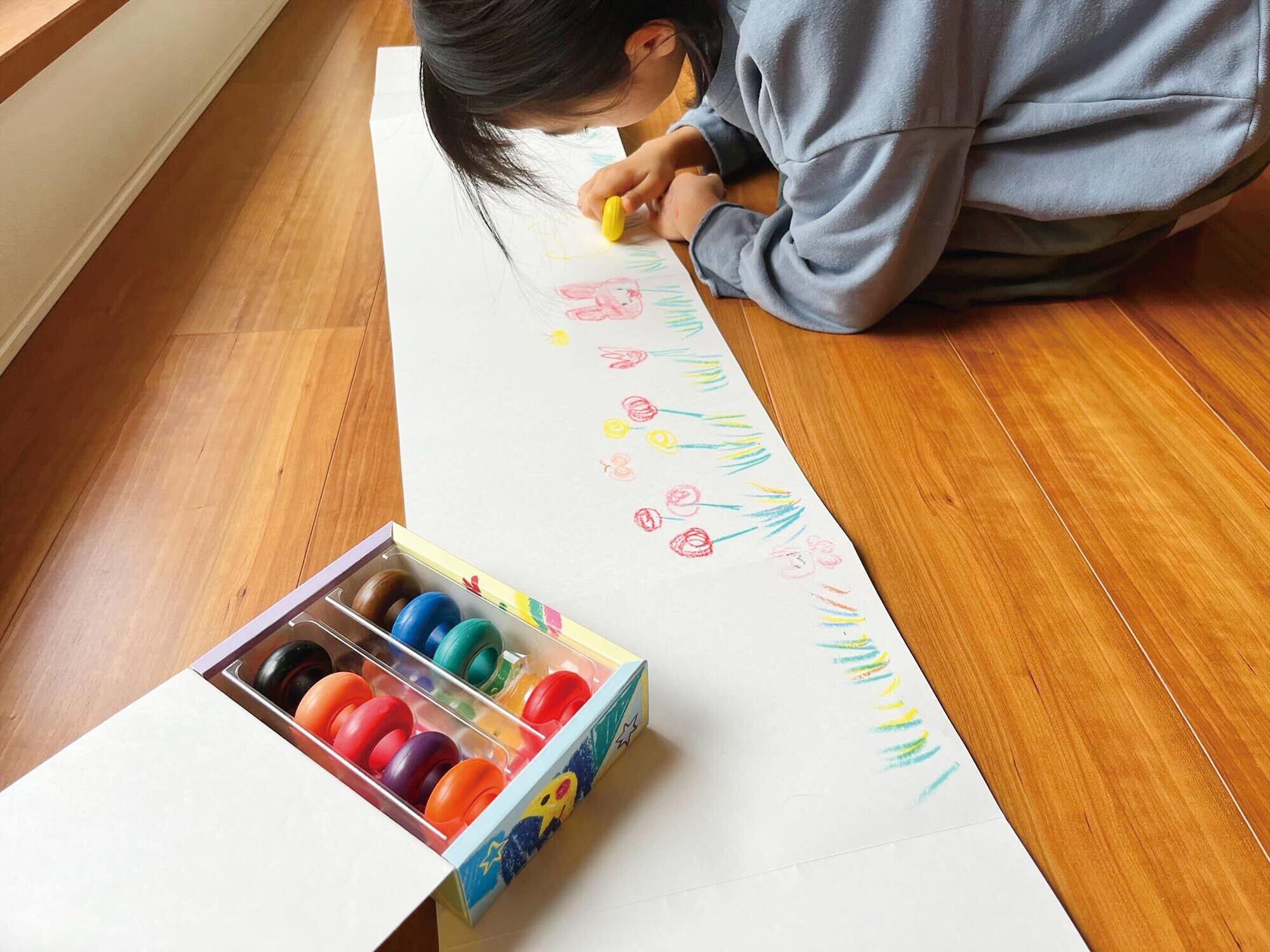 ●紙面がジャバラ状に伸びる新しいタイプのお絵かき帳です。●別売りのリングくれよんや、蛍光くれよん、透明くれよんを使って紙いっぱいに絵を描くことができます。●お絵かき帳を広げると全長3m56cmまで伸びるので家族や友達と一緒にお絵かきすることもできます。●描いた後はお絵かき帳を立てて飾ることもできます。●18ページ(両面36ページ)●絵/たちもとみちこ