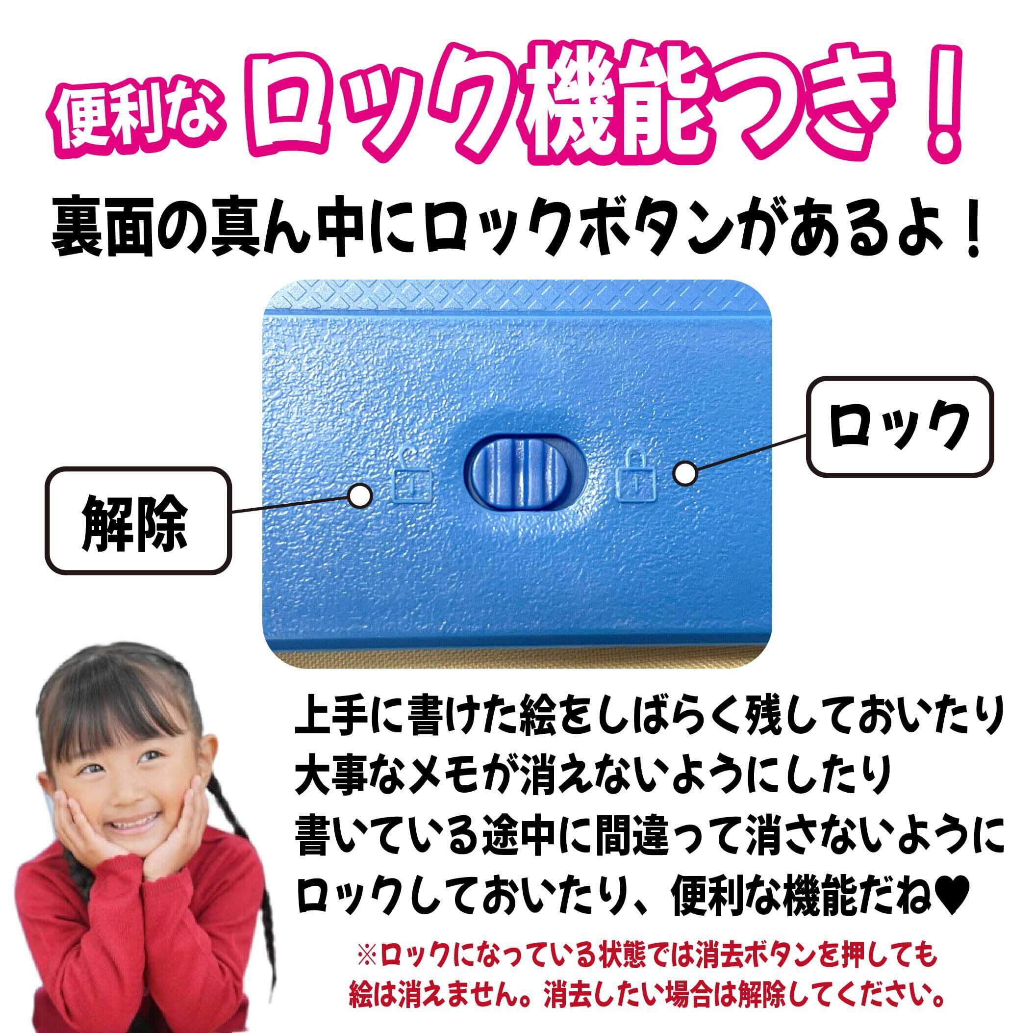 【使い方】付属のらくがき用ペンを使い、画面に自由に絵や字を書きます。本体下にある電源マークのボタンを押すとワンクリックで書いたものを全て消すことができます!背面にあるロックボタンを使用すれば書いた絵や字を一時的に残しておくことができます