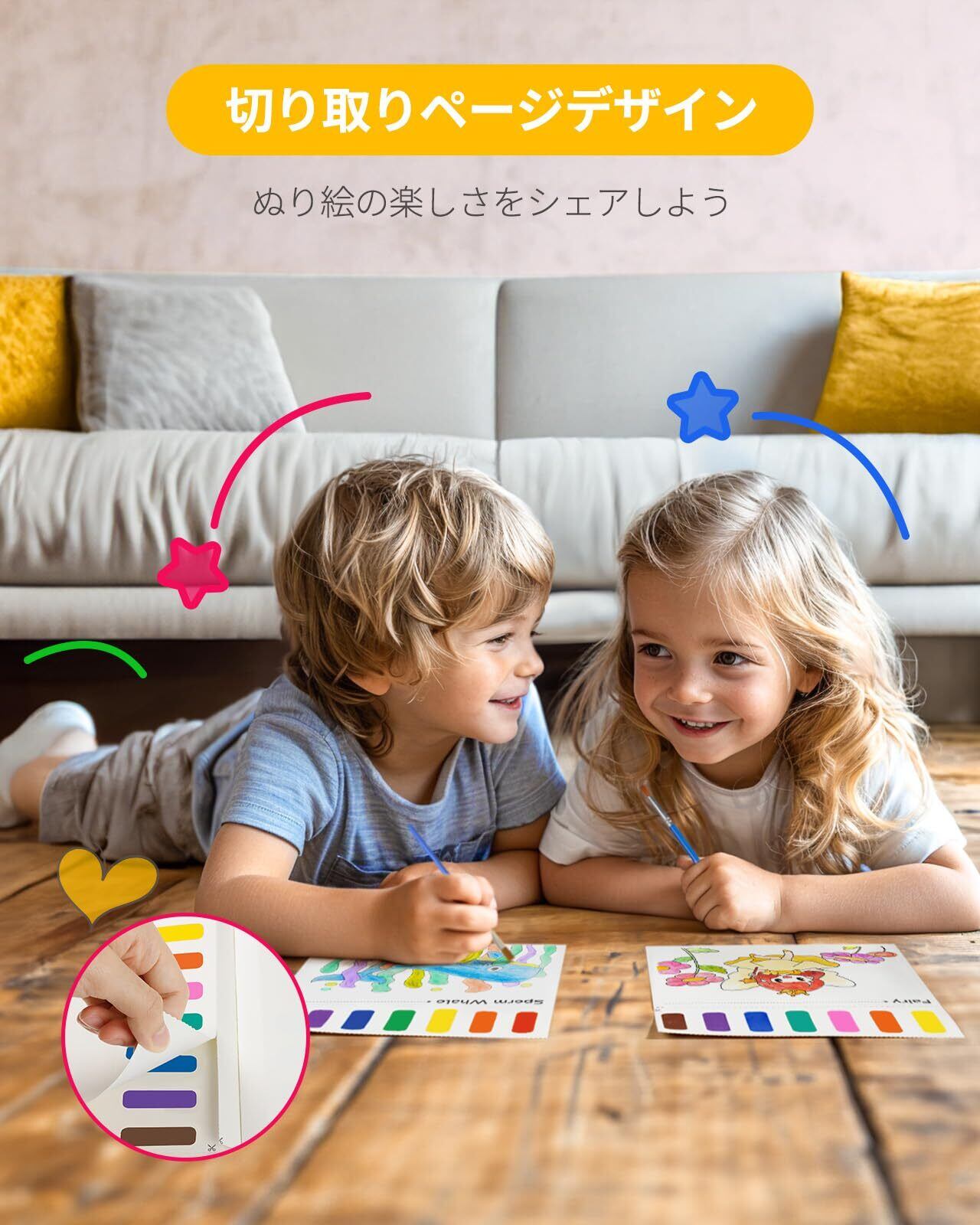 【創作を広げる水彩絵の具セット】各ページに固体水彩がたっぷり付いており、安全で柔らかな塗り心地。さらに1枚追加のぬりえ紙付きで、何度でも自由に創作可能。お絵描きを通じて、子供の想像力を引き出します。