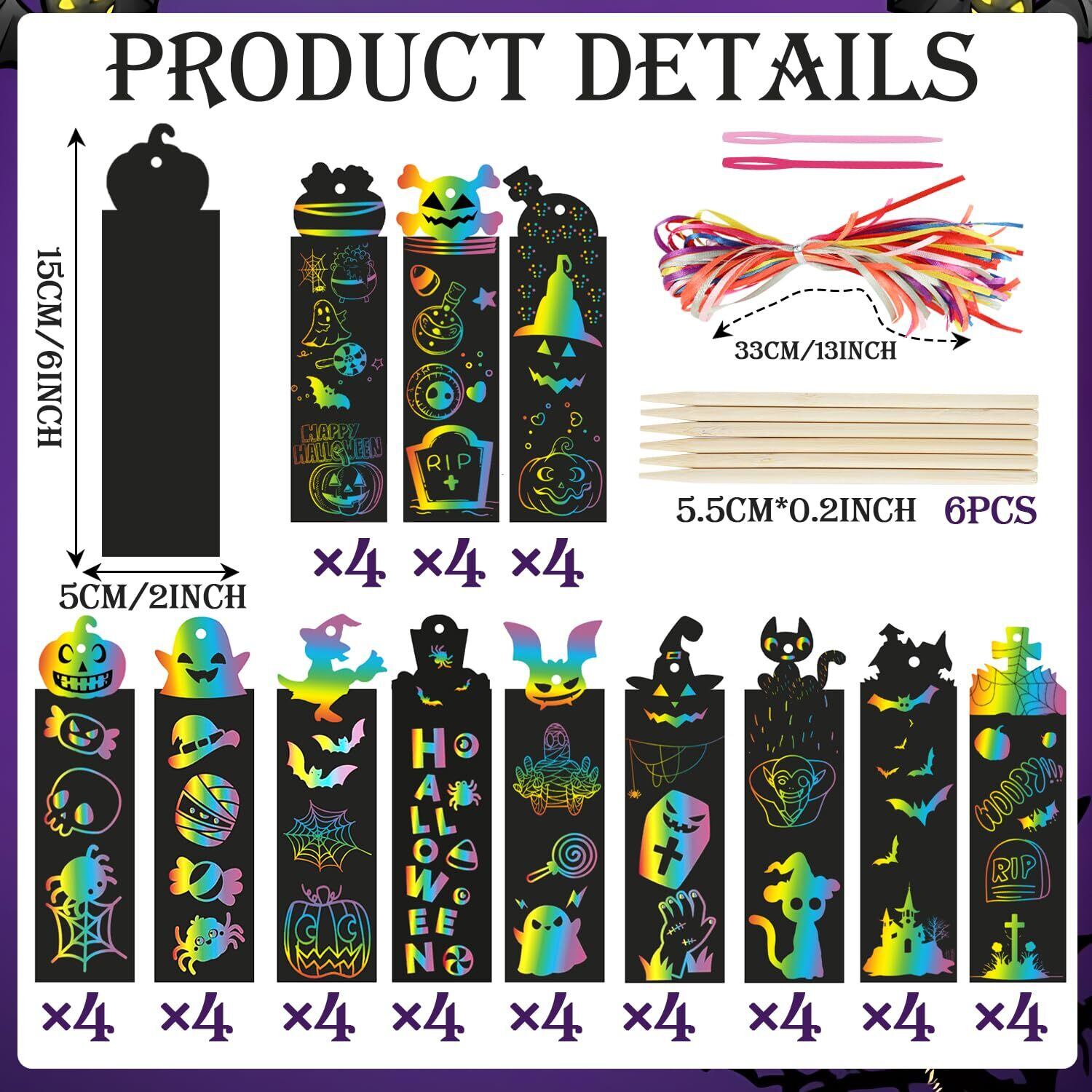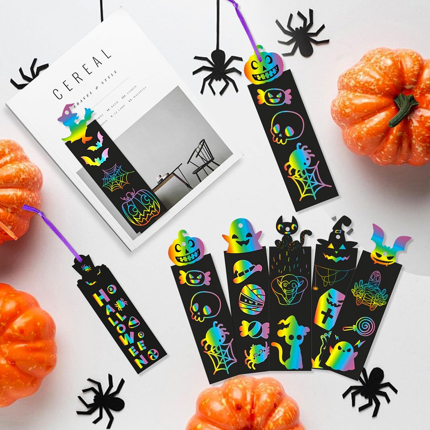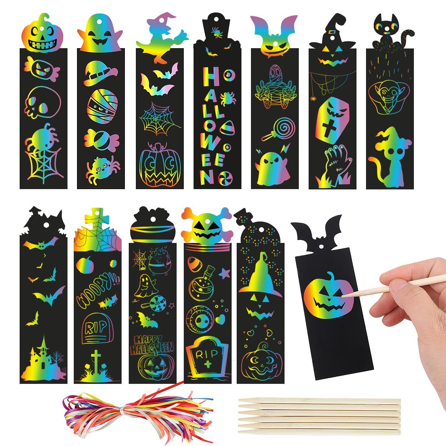 FINGOOO ハロウィン スクラッチアート 48枚 しおり ブックマーク おしゃれ 塗り絵 お絵描き 工作 DIY 手作り プレゼント 無地 虹絵ー (スクラッチアート)