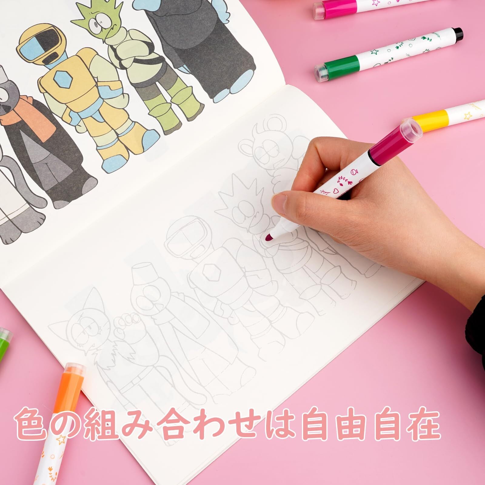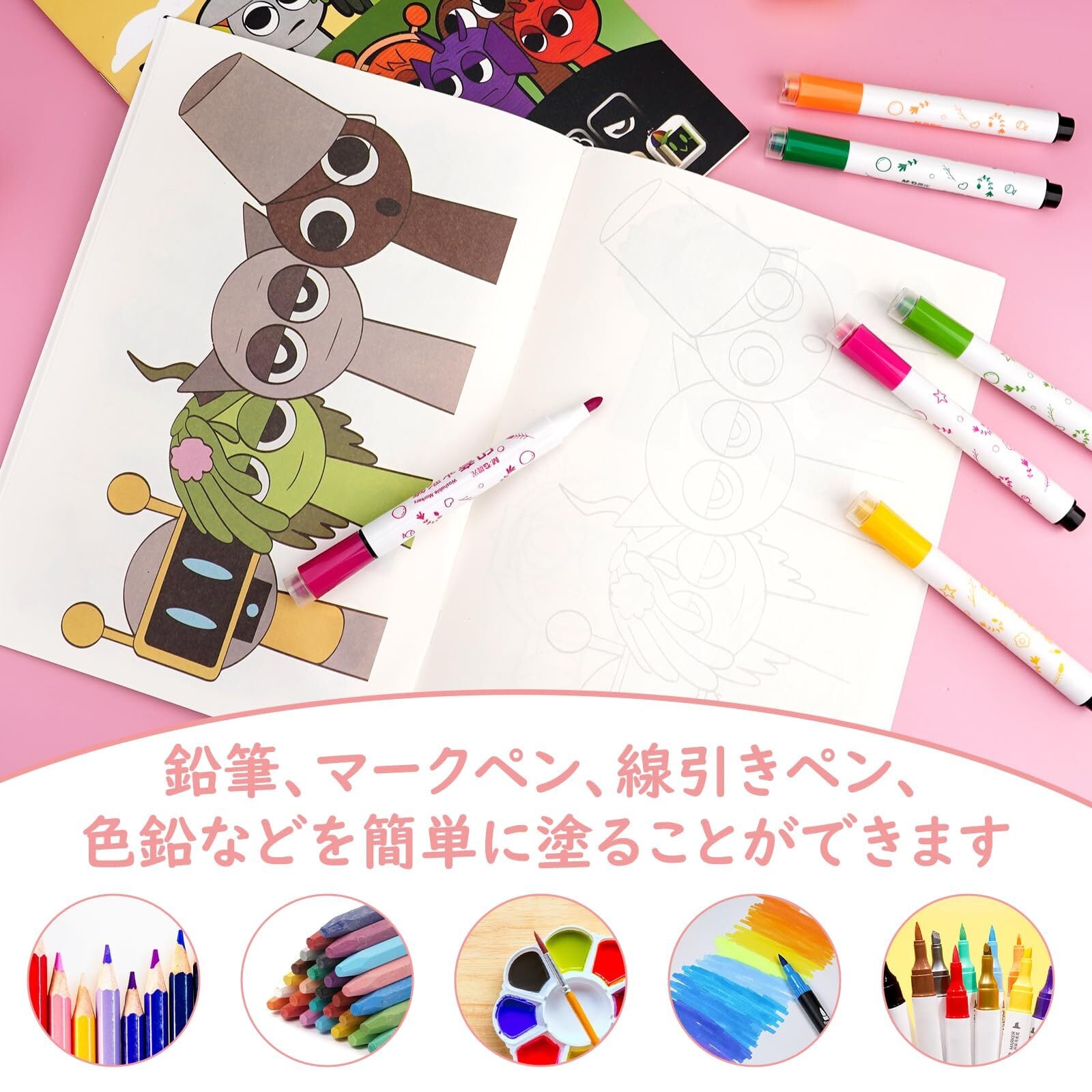 色を塗るときは、色鉛筆、カラーペン、カラーインクや水彩絵の具、ボールペンなどで自由な塗り方を楽しんでください。