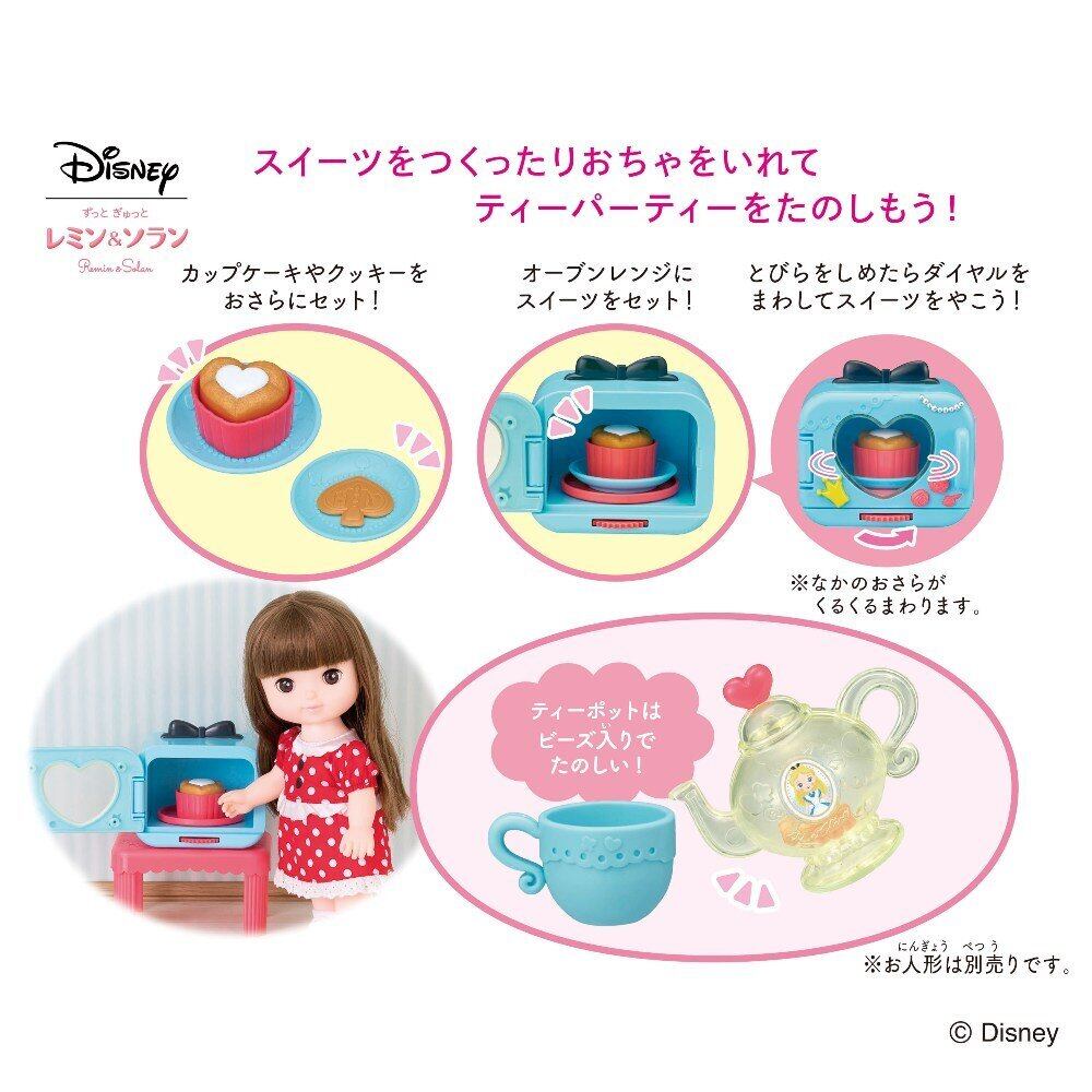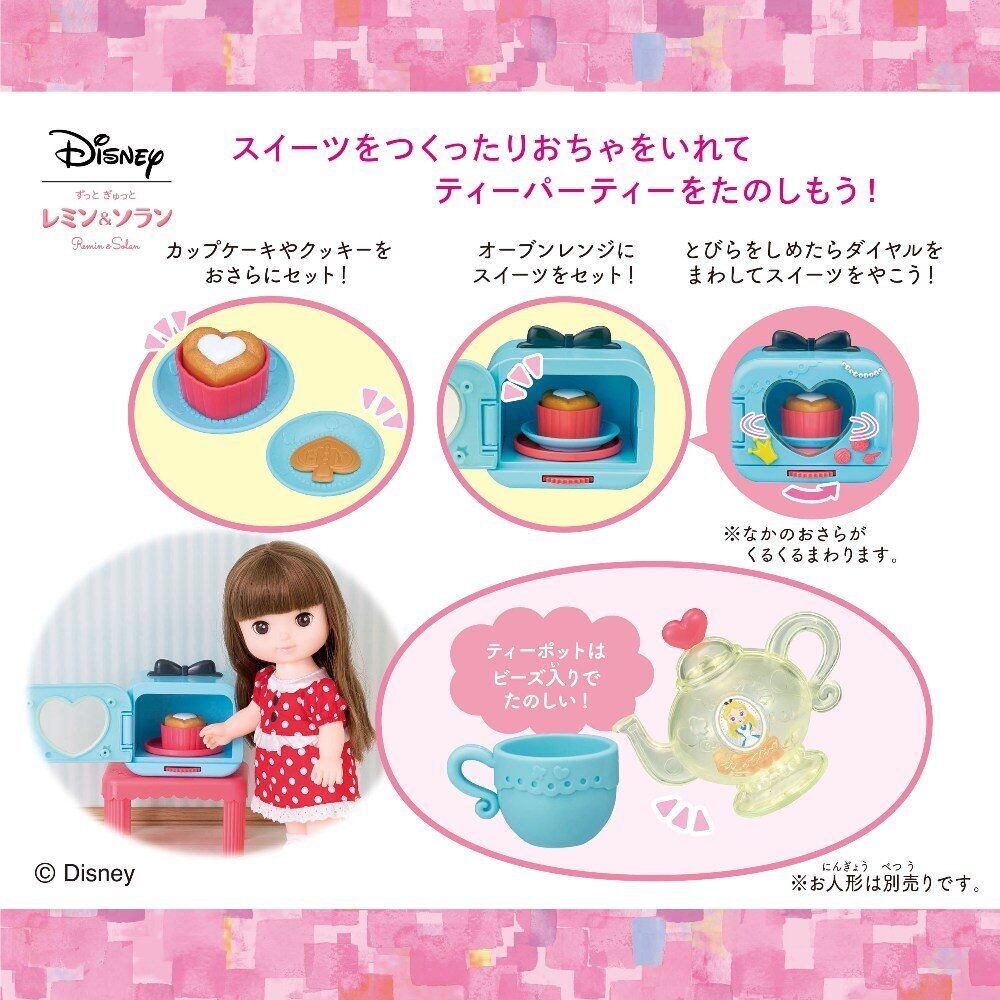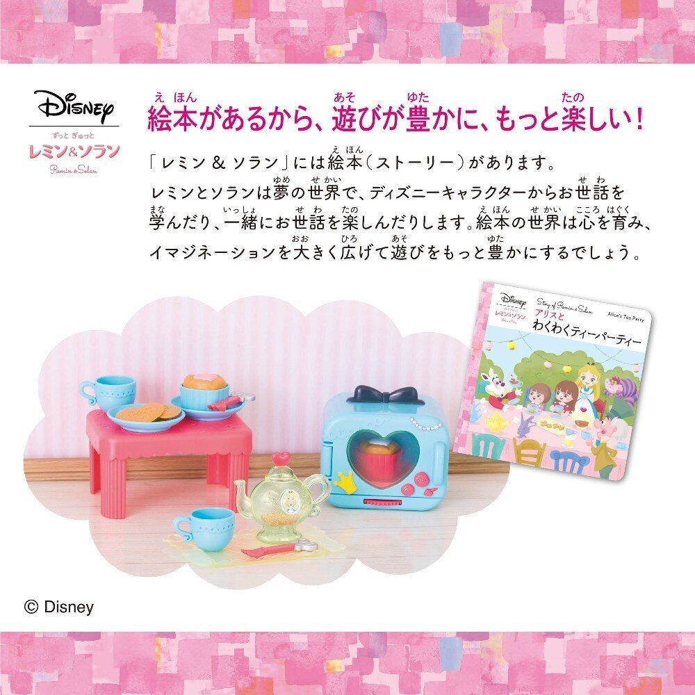 ディズニーとバンダイの共同製作で生まれた、新たなお世話人形、「ずっと ぎゅっと レミン&ソラン」より、アリス スイートティーパーティーセットが登場!!オーブンレンジ遊び、スイーツ遊び、ティーセット遊びが楽しめるセット。スイーツを作って、お茶と一緒にスイーツを食べさせる遊びが楽しめる。オーブンレンジはダイヤルを回すと中のお皿が回転する。アリスやマッドハッターが登場する絵本付き。