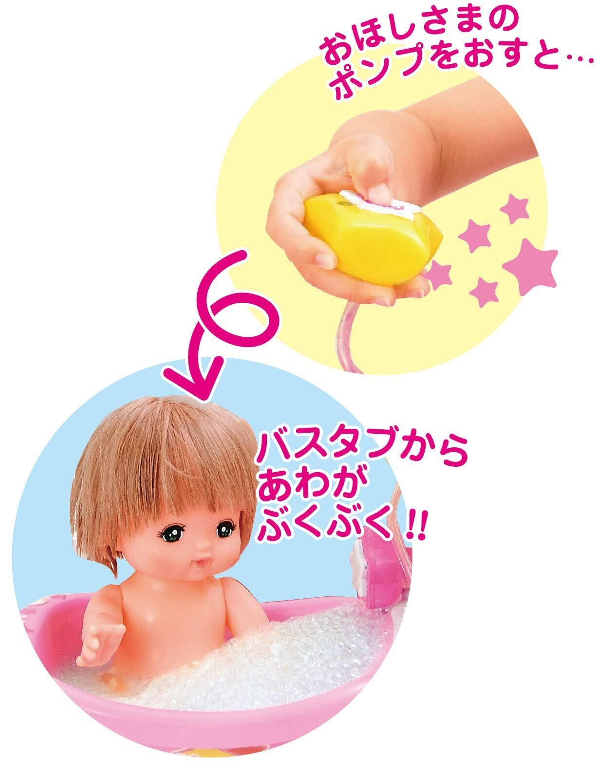 メルちゃんのバスタブができたよ! カワイイピンクのお風呂にメルちゃんを入れてあげてね。 お星様のポンプを押すとブクブク泡遊びもできちゃうの。 メルちゃんと一緒に楽しいバスタイムにしましょ! 【セット内容】 バスタブ本体、おほしさまのポンプ ※お人形はセットに含まれません。小物のみの商品です。 ■対象年齢 3歳以上