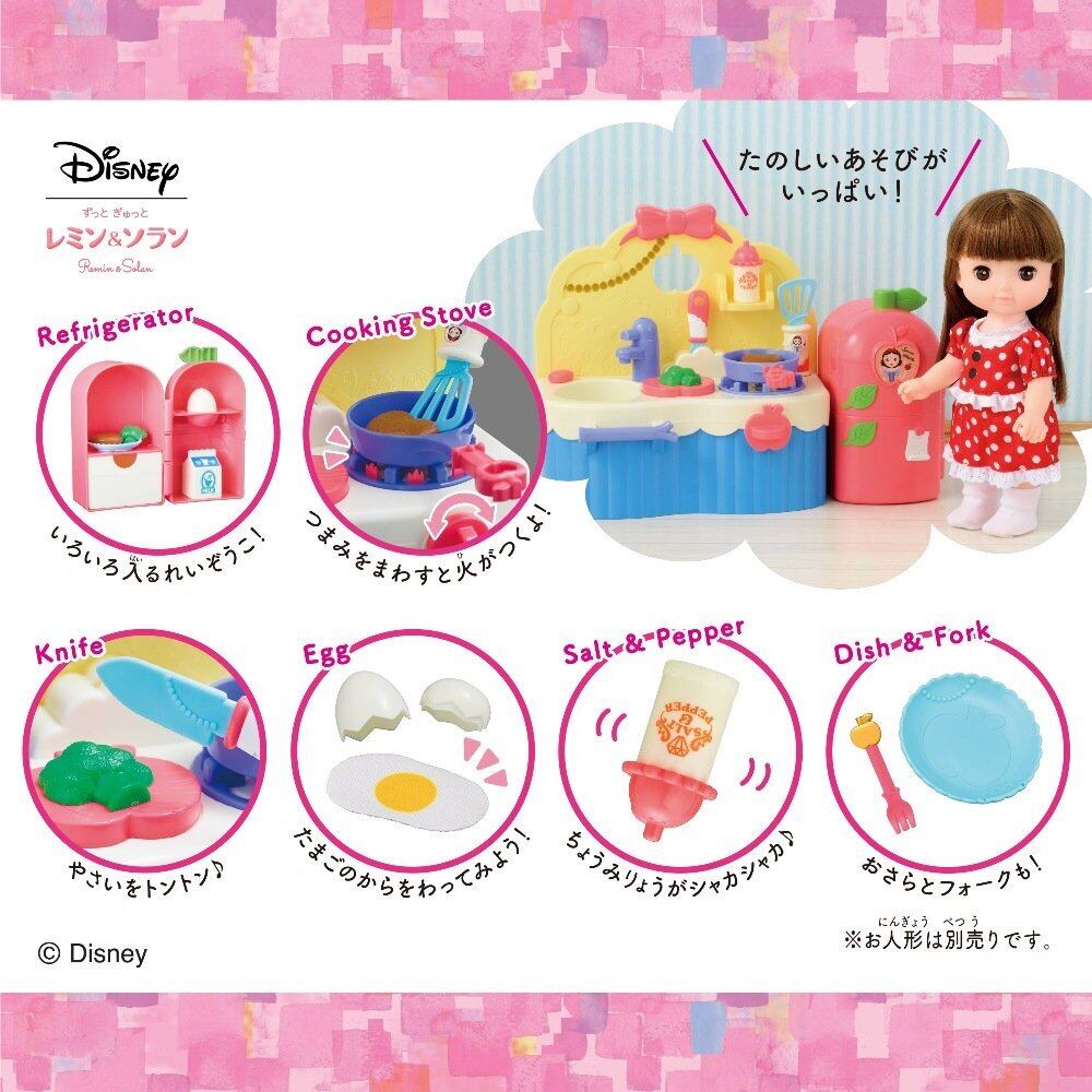 ディズニーとバンダイの共同製作で生まれた、新たなお世話人形、「ずっと ぎゅっと レミン&ソラン」より、しらゆきひめ あそびたっぷりキッチンが登場!!シンク遊び、コンロ遊び、包丁とんとん遊び、冷蔵庫遊びと、キッチンでやりたいことがつまった商品。ご飯をつくって食べさせる遊びが楽しめる。コンロのスイッチ遊び、卵わり遊びなど、楽しい遊びがいっぱい!しらゆきひめが登場する絵本付き。