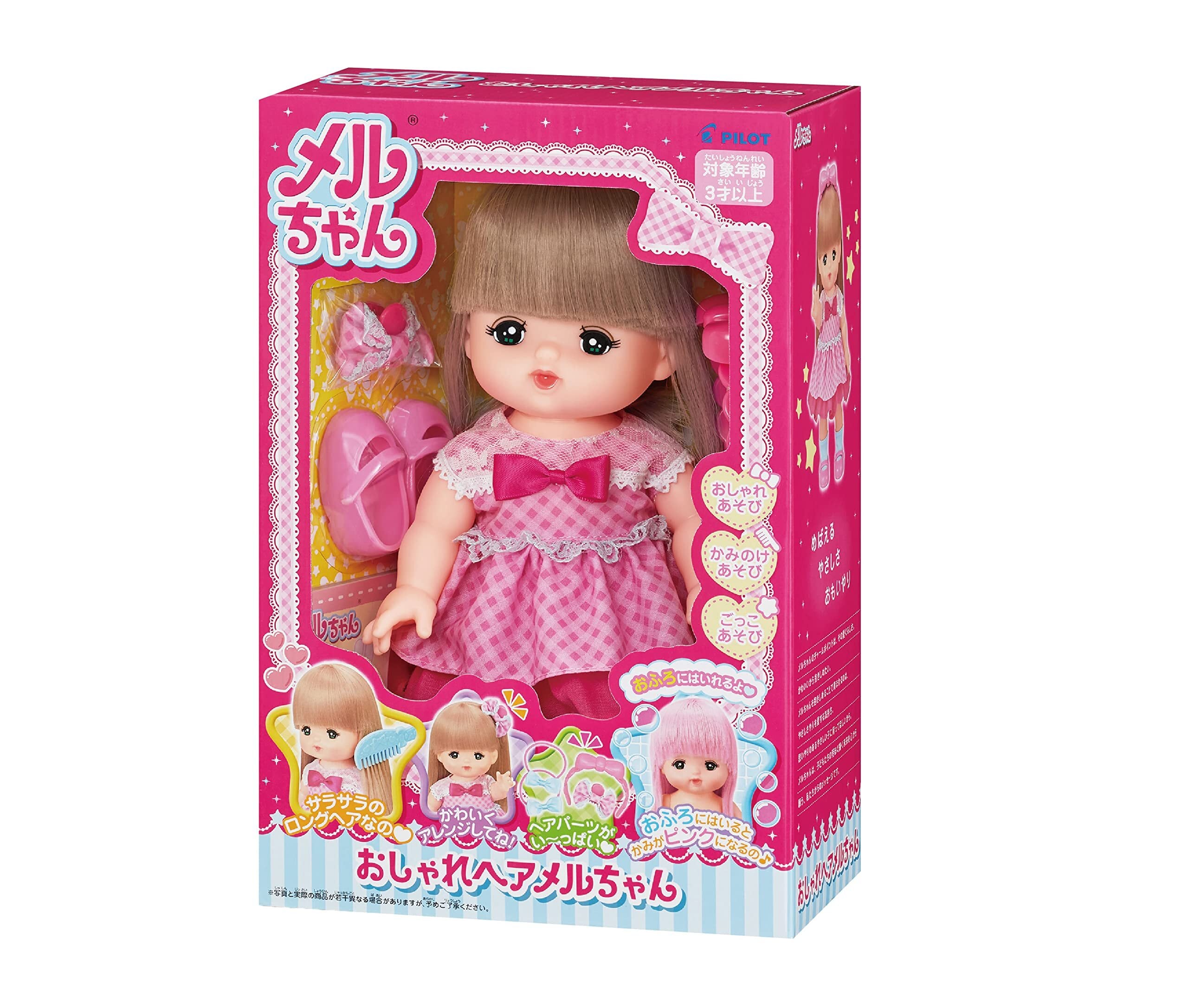 いろいろなヘアアレンジが楽しめるロングヘアメルちゃんがリニューアル。ヘアパーツを使っていろいろな髪形に可愛くアレンジしよう。大きなリボンがついたカチューシャや挟むだけの簡単クリップなど、ヘアパーツがいっぱい。おふろに入ると髪の色がピンク色に変化するよ。